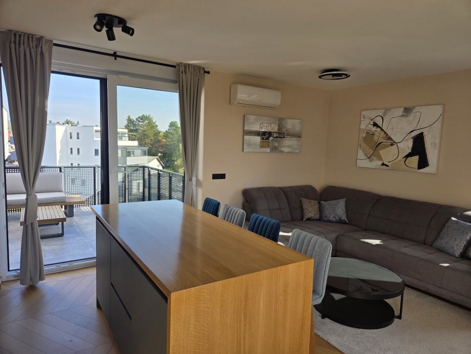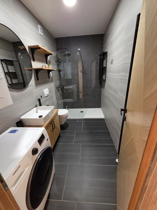 WC-om i walk in tušem, spavaće sobe s ugradbenim ormarima, te prostrane kuhinje po mjeri s otokom i svim aparatima, blagovaonice i dnevnog boravka s izlazima na 2 velike terase (16 m² +10m2).