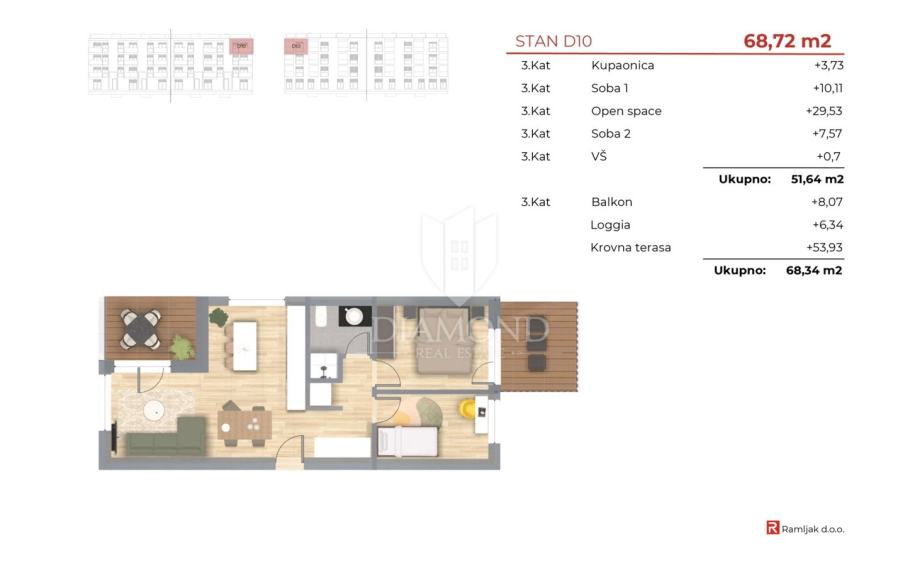 Stan se nalazi na drugom katu i prostire se na 68,72 m². Sastoji se od otvorenog dnevnog boravka povezanog s kuhinjom i blagovaonicom, dvije udobne spavaće sobe i moderne kupaonice. Balkon pruža pogled na more, dok lođa nudi opuštajući pogled na okolnu prirodu.