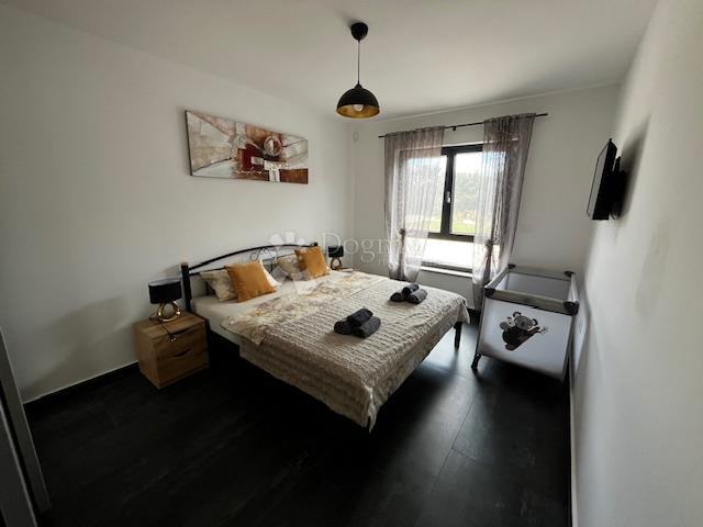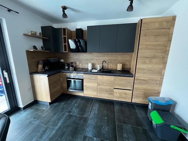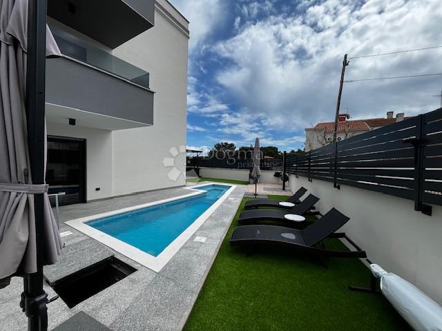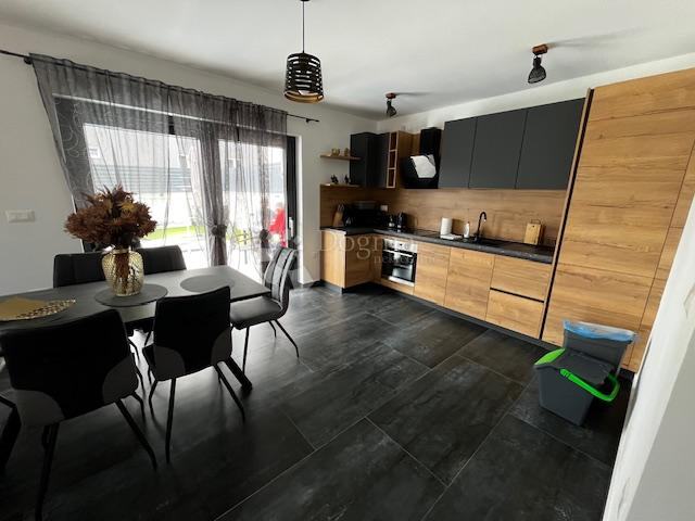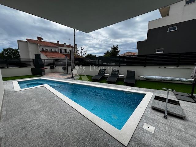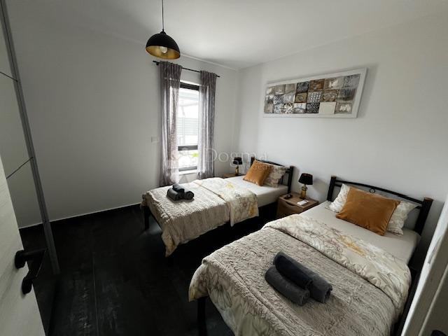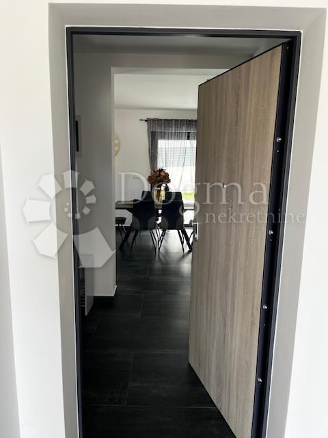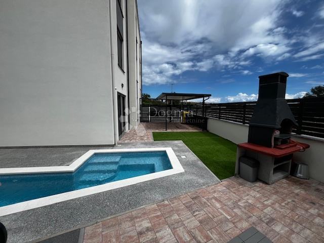 Hodnik i Garderoba: Prvi dojam je važan, a ovaj dobro osmišljeni hodnik dočekuje vas s praktičnom garderobom za vaše potrebe. Luksuzno uređena kupaonica pruža osjećaj wellnessa u udobnosti vašeg doma. Dvije Spavaće Sobe: Prostrane i udobne spavaće sobe osiguravaju miran san i odmor. Dnevna Soba: Prozračna dnevna soba stvara ugodan prostor za druženje s obitelji i prijateljima. Kuhinja i Blagovaonica: Moderna kuhinja opremljena je vrhunskom opremom i otvorena prema blagovaonici, idealna za kuhanje i zabavu. Natkrivena Terasa: Proširite svoj životni prostor na predivnu natkrivenu terasu, savršenu za uživanje u vanjskom prostoru u svako doba godine. Bazen: Stan ima privatni bazen, pružajući vam osvježenje i opuštanje u vlastitom dvorištu. Spremište: Dodatni prostor za pohranu vaših osobnih stvari. Stan ima podno grijanje. Parkirna Mjesta: Uz stan dolaze dva parkirna mjesta, što osigurava praktičnost i sigurnost vašeg vozila.