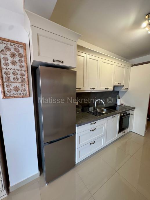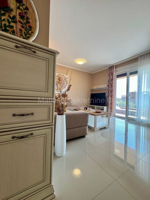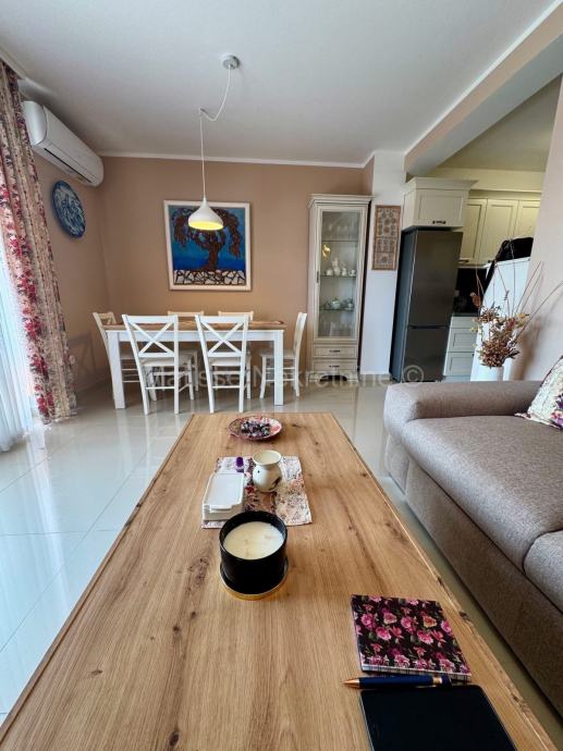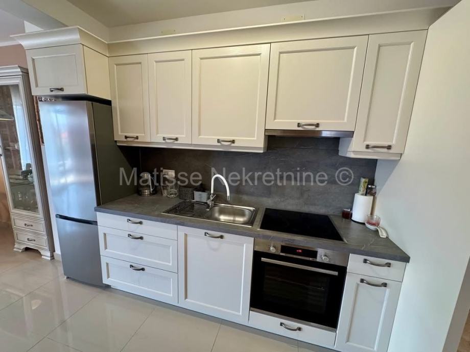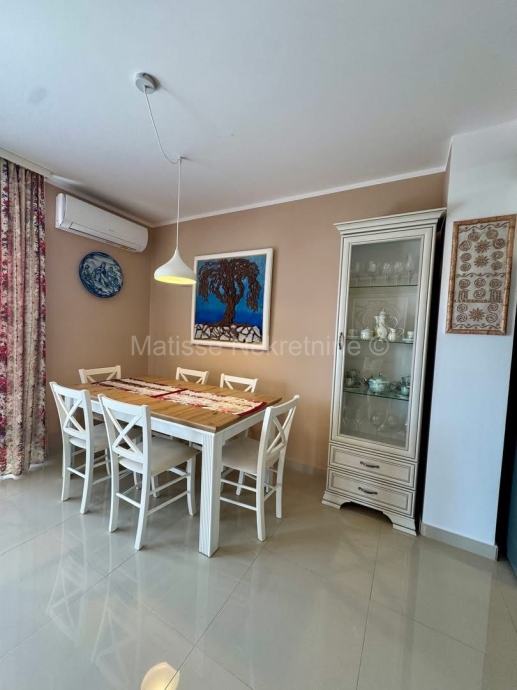 Stan se sastoji od otvorenog dnevnog boravka s kuhinjom i blagovaonicom, dvije spavaće sobe te prostrane terase sa koje se pruža prekrasan pogled na more.