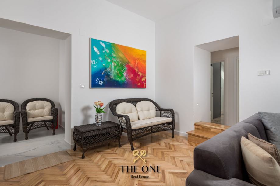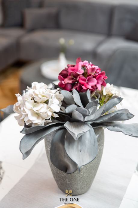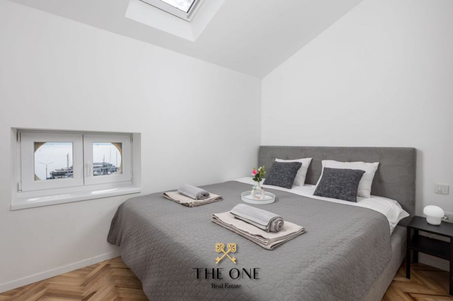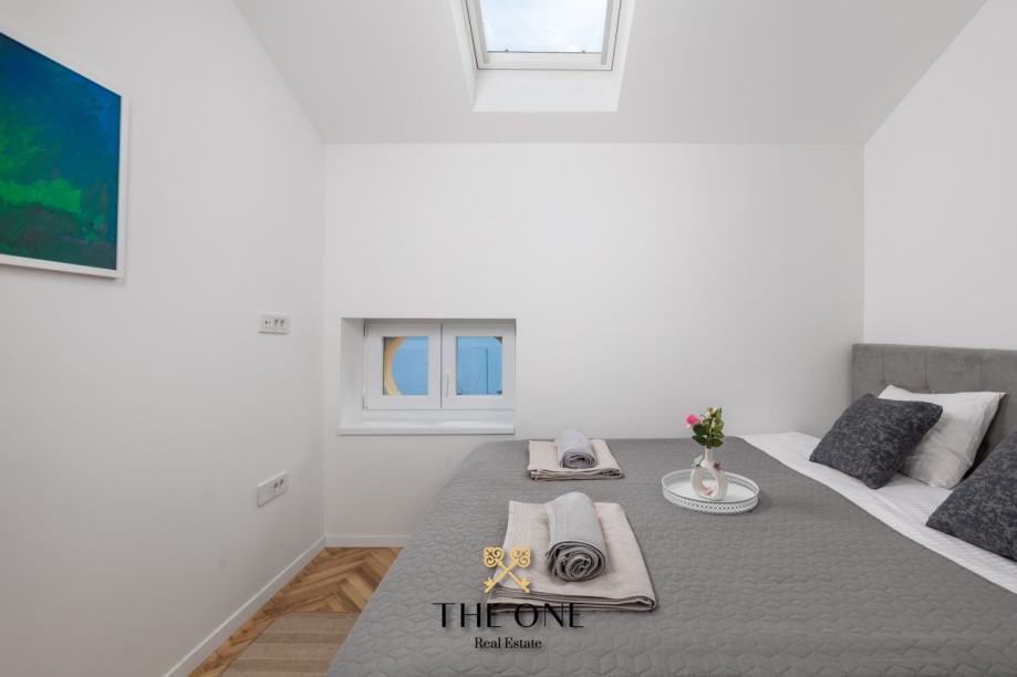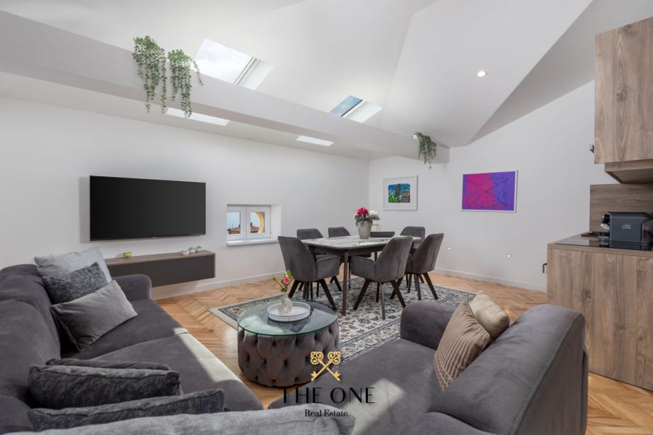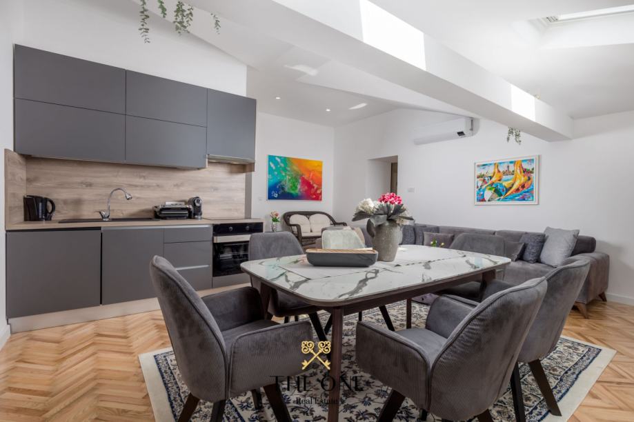Stan se nalazi u visokom potkrovlju vile, što pruža poseban osjećaj privatnosti i mira. Veliki otvoreni koncept dnevnog boravka, blagovaonice i moderne kuhinje zauzima centralni dio stana. Prostran i funkcionalan raspored omogućava maksimalno iskorištenje prostora i stvara ugodnu atmosferu za odmor i druženje.