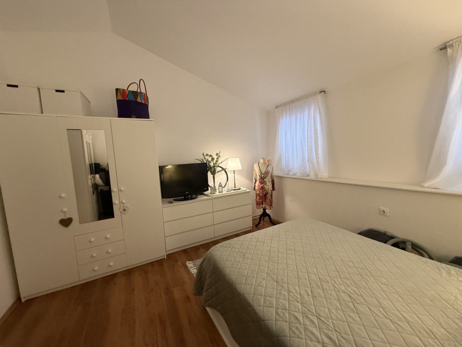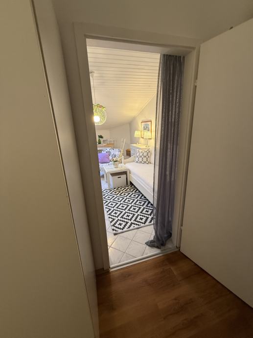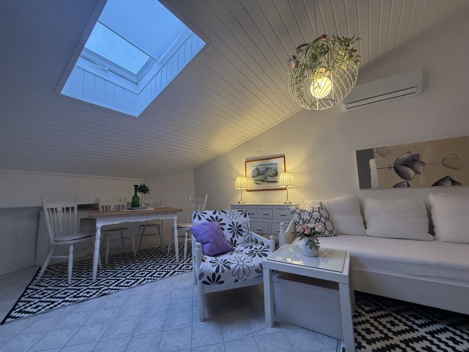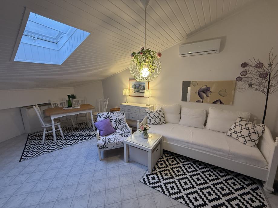 Prostor odiše toplinom i karakterom, s pažljivo biranim detaljima i ugodnom atmosferom. Zbog svoje pozicije u potkrovlju, stan pruža dodatni osjećaj intime i šarma, uz obilje prirodnog svjetla.