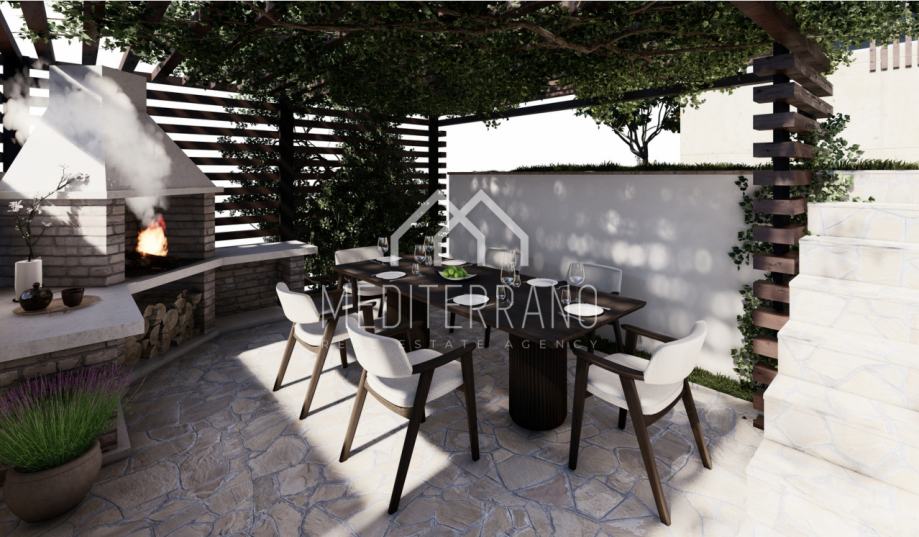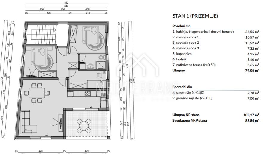 Stan se sastoji od kuhinje s blagovaonicom i dnevnim boravkom, 3 spavaće sobe, hodnika i kupaonice. Ukupno stambenog prostora ima 72.41 m2 te prekrasnu terasu od 13,30 m2. Stanu pripadaju i garažno mjesto te spremište od 5,56 m2.