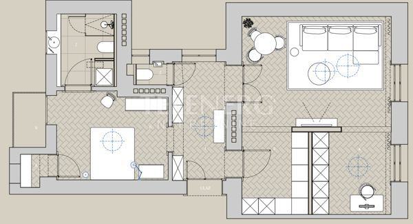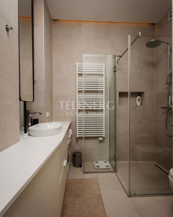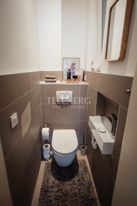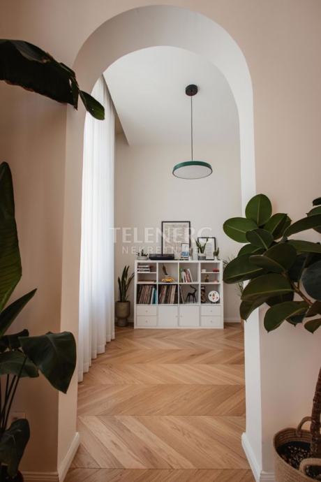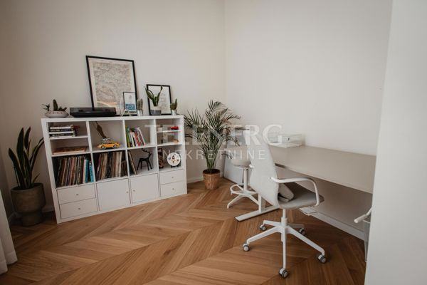Raspored prostorija uključuje hodnik, dnevni boravak, kuhinju, glavnu spavaću sobu, kupaonicu, gostinjski wc, te drugu spavaću sobu/ured i balkon.