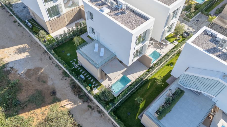 Vila je pažljivo osmišljena kako bi zadovoljila potrebe i najzahtjevnijih kupaca. Prostrana unutrašnjost uključuje četiri spavaće sobe (14,61 m2, 9,60 m2, 14,61 m2 i 12,29 m2), prostrani dnevni boravak s kuhinjom i blagovaonicom od 30,89 m2 te podrum površine 25,89 m2. Orijentacija prema jugu, jugozapadu i zapadu osigurava obilje prirodnog svjetla tijekom cijelog dana te omogućuje uživanje u toplim, sunčanim prostorijama.
