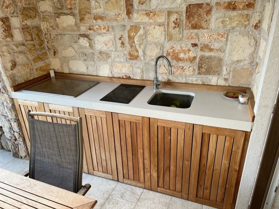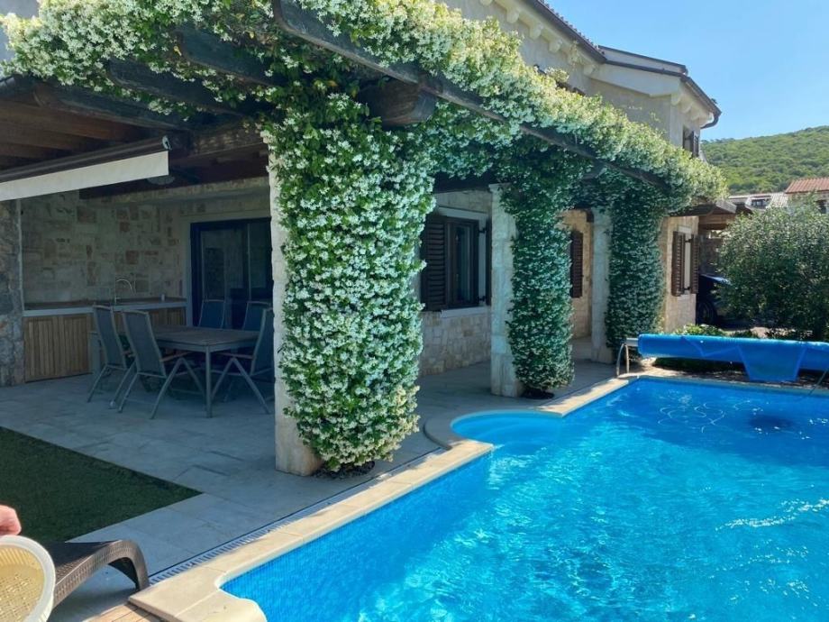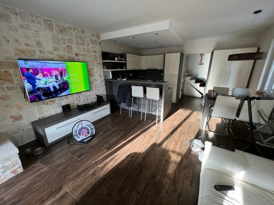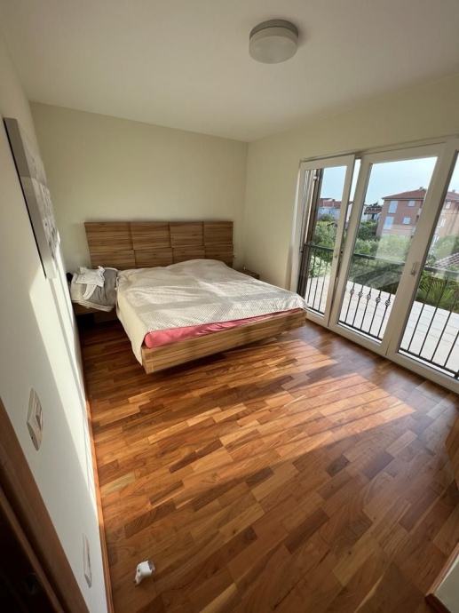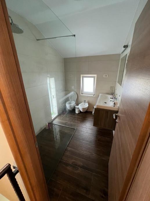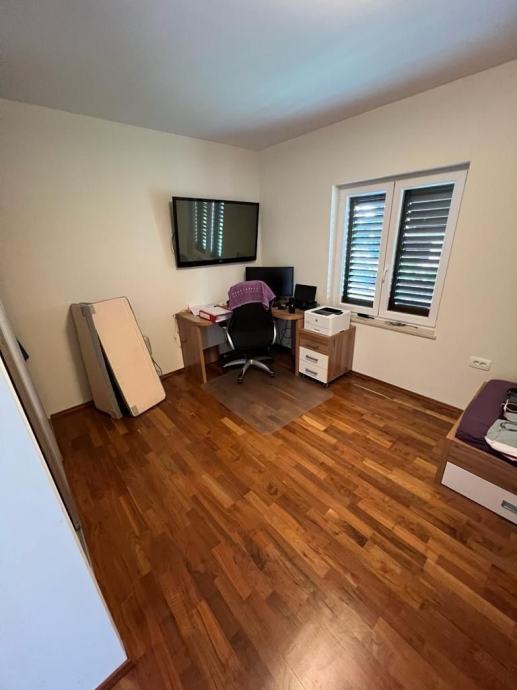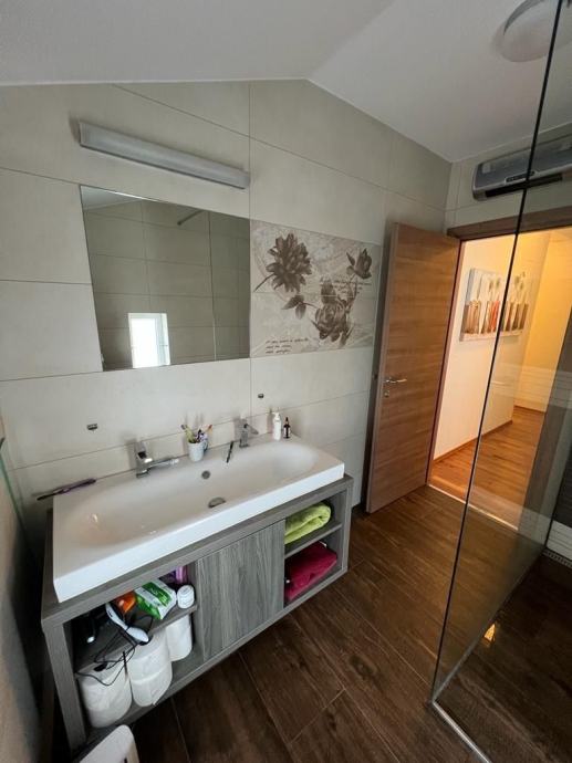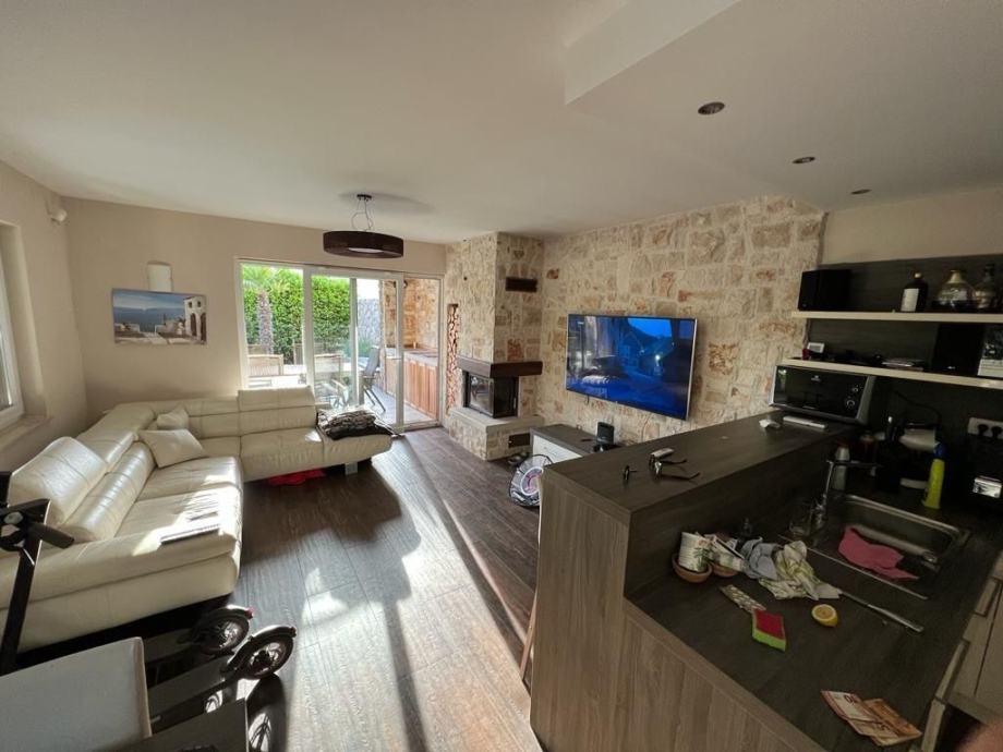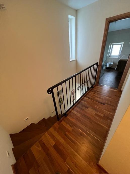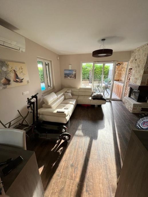 Novo u ekskluzivnoj prodaji! Prekrasna dvojna kuća u Puntu, izgrađena 2010. godine. Ova polovica dvojne kuće prostire se na dvije etaže, pružajući udobnost, domaćinstvo i luksuzni životni prostor. Prizemlje ove dvojne kuće prostire se na ukupnoj površini od 57 m2 i obuhvaća prostrani dnevni boravak, kuhinju i blagovaonicu, te WC. Iz dnevnog boravka vodi vrata na terasu koja je natkrivena, pružajući zaštitu od kiše i vjetra te omogućavajući uživanje u otvorenom prostoru tijekom cijele godine. Gornja etaža nudi dvije spavaće sobe (19m2 i 13m2), te prostranu kupaonicu (6m2). Stan je kompletno namješten vrhunskim namještajem po mjeri, uključujući, klima uređaje na obje etaže i stolariju visoke kvalitete, pružajući sofisticiran i moderan ambijent. Ova nekretnina ima dodatnu vrijednost zbog privatne okućnice s bazenom, potpuno ograđene, za apsolutnu privatnost. Uz terasu, ova nekretnina ima i vanjsku kuhinju, koja stvara dodatni prostor za uživanje i druženje s obitelji ili prijateljima. Stanu pripadaju i 3 parkirna mjesta, od kojih je jedno i natkriveno. Nekretnina je smještena u mirnom dijelu Punta, a na pješačkoj udaljenosti do mora i svih sadržaja, čineći je idealnim domom, za udoban i luksuzan život.