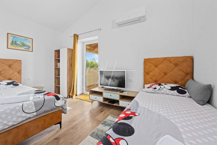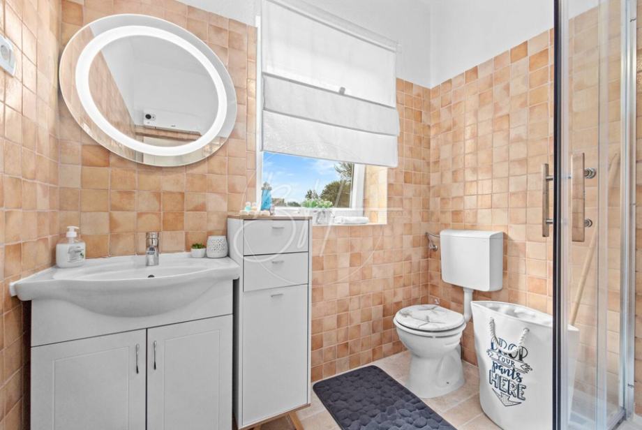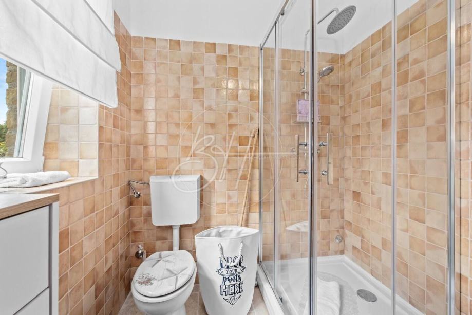 Posebnu vrijednost daje vanjski prostor s velikim bazenom 80 m2 (dječiji bazen 30 m2 visine 40 cm i bazen za odrasle 50 m2 i visine 1.35 m) , natkrivenom blagovaonicom, roštiljem i uređenim vrtom – savršenim za opuštanje i druženje tijekom toplijih mjeseci.
