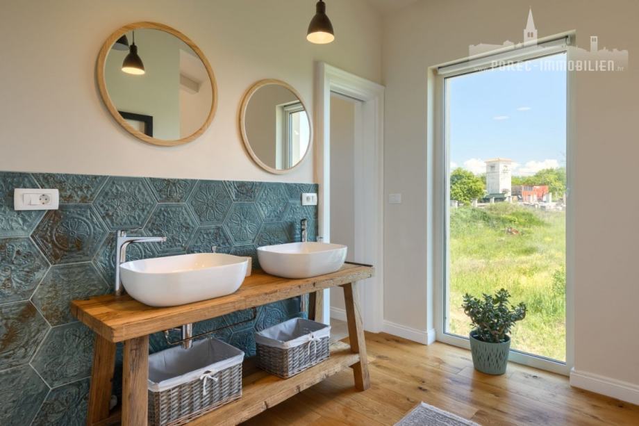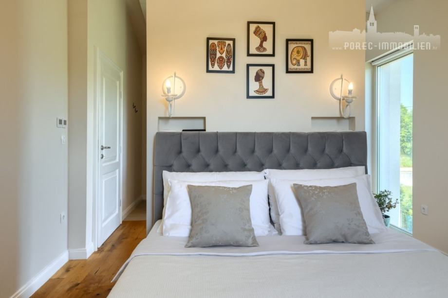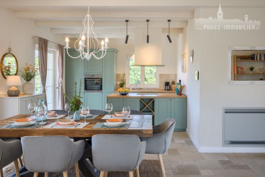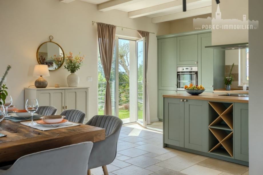 U prizemlju se nalaze otvoreni veliki dnevni boravak sa potpuno opremljenom kuhinjom i blagovaonom, terasa sa stolom za objedovanje, spavaća soba sa vlastitom kupaonom, spremište, wc za goste i kotlovnica, dok se na katu nalaze tri spavaće sobe, svaka sa vlastitom kupaonicom, a jedna soba ima izlaz na terasu sa koje seže pogled u daljinu i netaknutu prirodu.