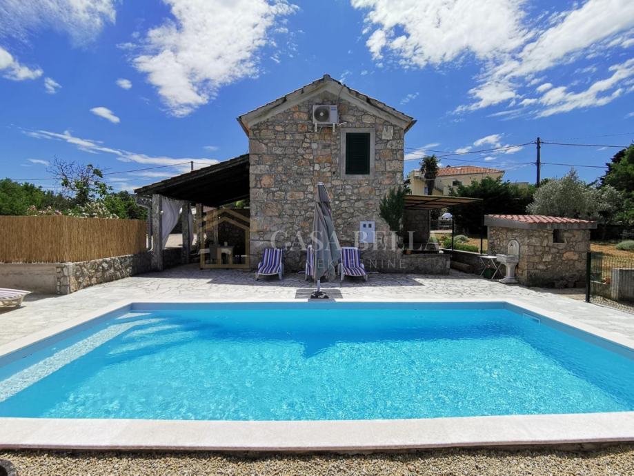 Okućnica površine 960 m² uređena je s puno pažnje – sadrži bazen, konobu, vrt, vrtnu kućicu i roštilj. Na raspolaganju je i više od sedam parkirnih mjesta.