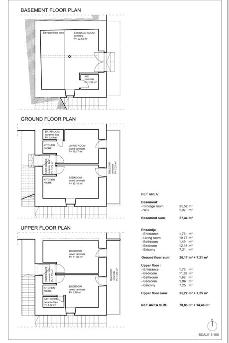 Ukupna neto površina kuće iznosi 79 m2, dok je svaki balkon oko 7 m2 s prekrasnim pogledom na more i uvalu. Prizemlje i prvi kat kuće su u vrlo dobrom stanju, dok se podrum može urediti kao stambeni ili poslovni prostor ili konoba. Okućnica ispred kuće (sada neuređena) je veličine 34 m2, na kojoj se može napraviti parking za 2 auta ili terasa za konobu ili oboje, dok je pripadajući dio zajedničkog dvorišta gdje je ulaz u kuću sa stražnje strane veličine 17 m2. Drveni podovi između etaža zamijenjeni su betonskim pločama.