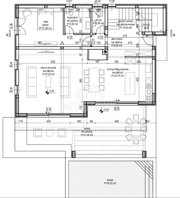Prizemlje: Ulazni hodnik (10 m²), spavaća soba s vlastitom kupaonicom, gostinjski WC, kuhinja i blagovaonica (23,75 m²), dnevni boravak (37,20 m²) s izlazom na natkrivenu terasu (42 m²), bazen (30 m²).