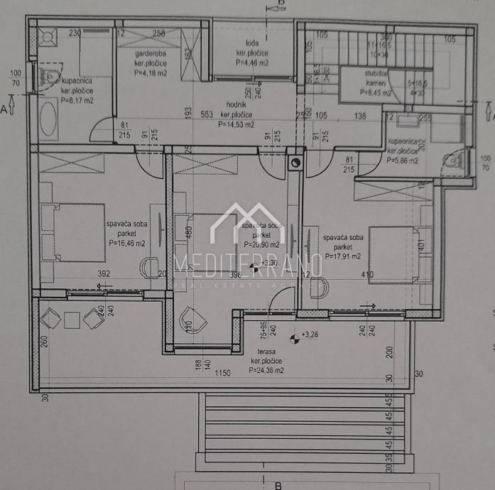 Kat: Tri spavaće sobe (jedna s privatnom kupaonicom), dodatna kupaonica, garderoba, hodnik, loggia (5 m²), prostrana terasa (24 m²)