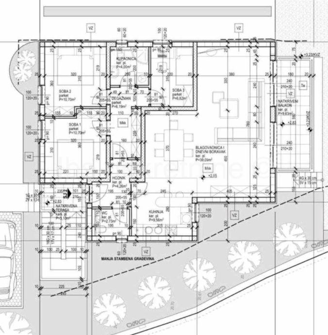 Kuća se sastoji od prizemlja 114m2 i kata 110m2.
