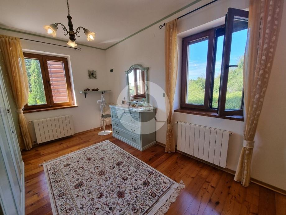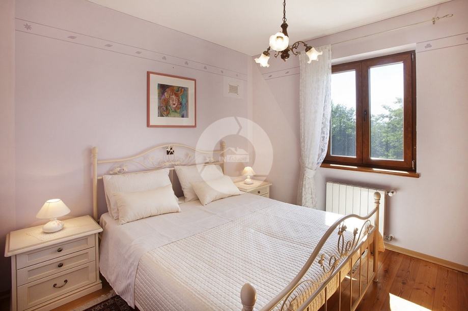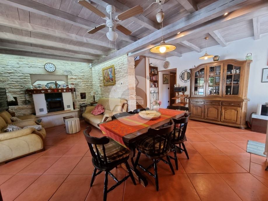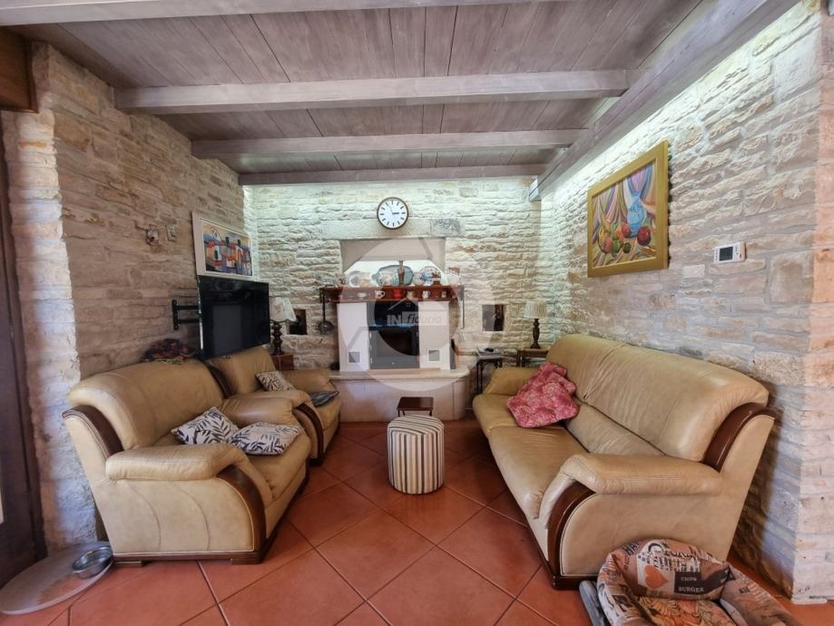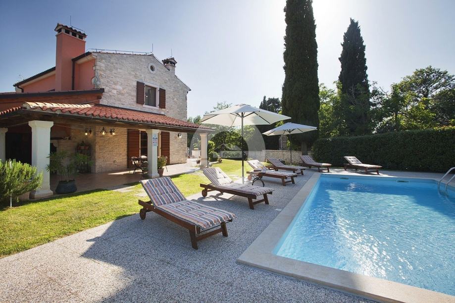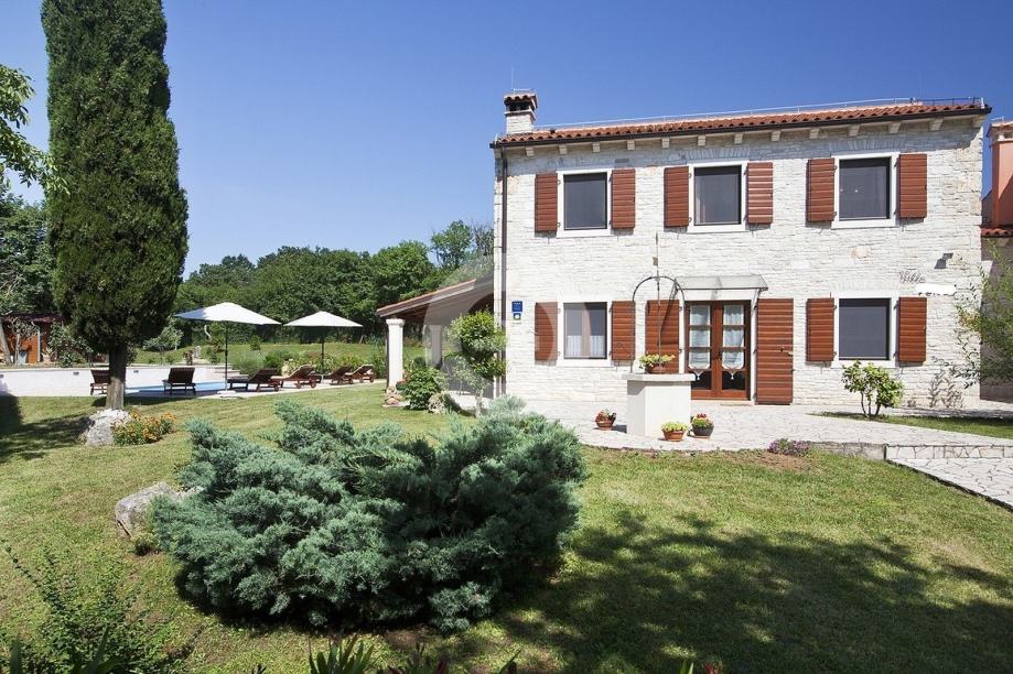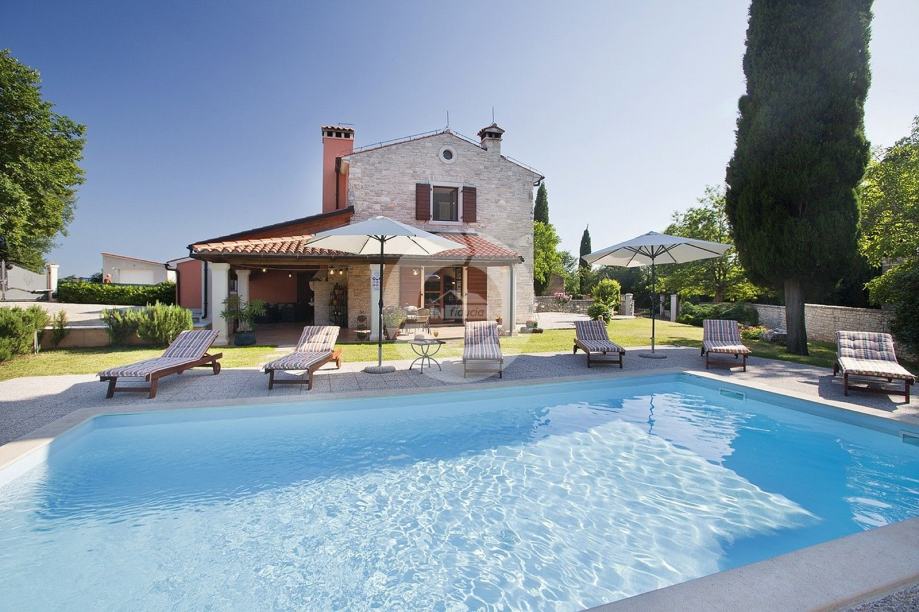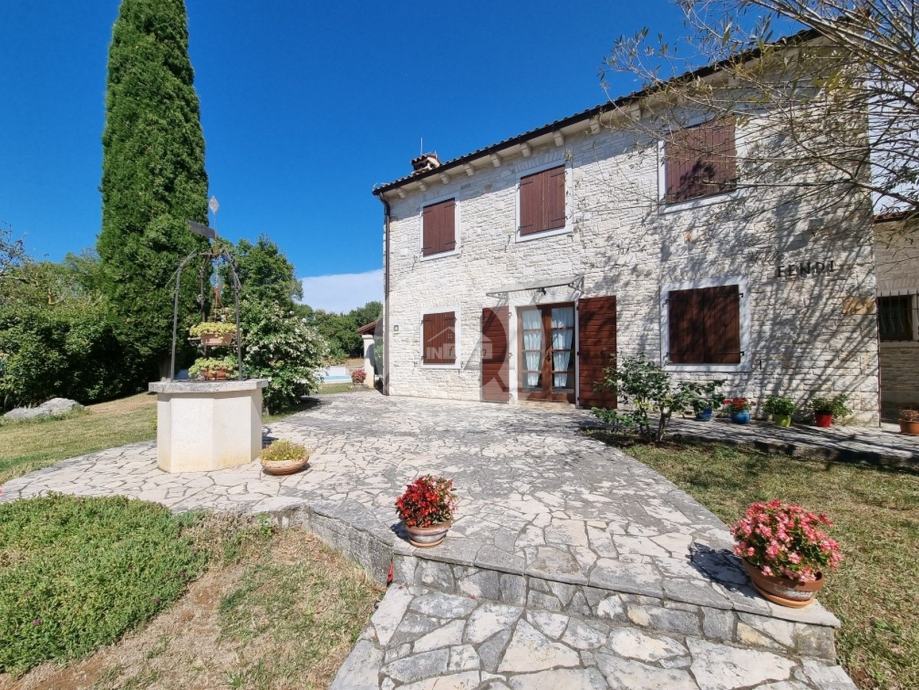 Prekrasna kuća s bazenom nalazi se u okolici poznatog istarskog gradića Barban (cca 6 km), u jednom malom mjestu udaljenom svega 2 km od mora. Kuću krasi upravo lokacija koja pruža maksimalnu privatnost i mirnoću, te veličina zemljišta na kojoj se kuća nalazi- 2200 m2, odnosno okućnice 2020 m2. Sagrađena je 2008. godine, te kompletno opremljena namještajem i tehnikom. Sastoji se od prizemlja i kata. U prizemlju se nalazi hodnik, kuhinja, blagovaona, dnevni boravak s kaminom i vrata za izlazak na veliku natkrivenu terasu gdje se nalazi još jedan kamin. U prizemlju se još nalazi jedna spavaća soba, kupaona, te spremište/praona, radionica, kotlovnica i garaža. Unutarnjim drvenim stepenicama se odlazi na kat gdje su smještene tri spavaće sobe (dvije velike sobe i jedna manja) i velika kupaona. Kuća je opremljena kvalitetnim namještajem, keramikom i sanitarijama. Ima centralni sustav za grijanje na naftu, peć na pelete i kamin. Ima prilaz kući sa dvije strane što je njezina prednost jer se drugi dio parcele od 1342 m2 može iskoristiti kao građevinsko zemljšite za eventualni drugi objekat, ne vezano za glavnu kuću. Okućnica je uređena, kompletan teren je ograđen djelomično kamenim zidom, djelomično visokom živicom, tako da garantira privatnost. Vrt ima navodnjavanje i bazen od 32 m2 sa sunčalištem, te cisternu. Također u vrtu postoji drvena kućica u kojoj se nalazi strojarnica bazena. Kuća je idealan izbor kao kuća za iznajmljivanje ili kao obiteljska kuća.