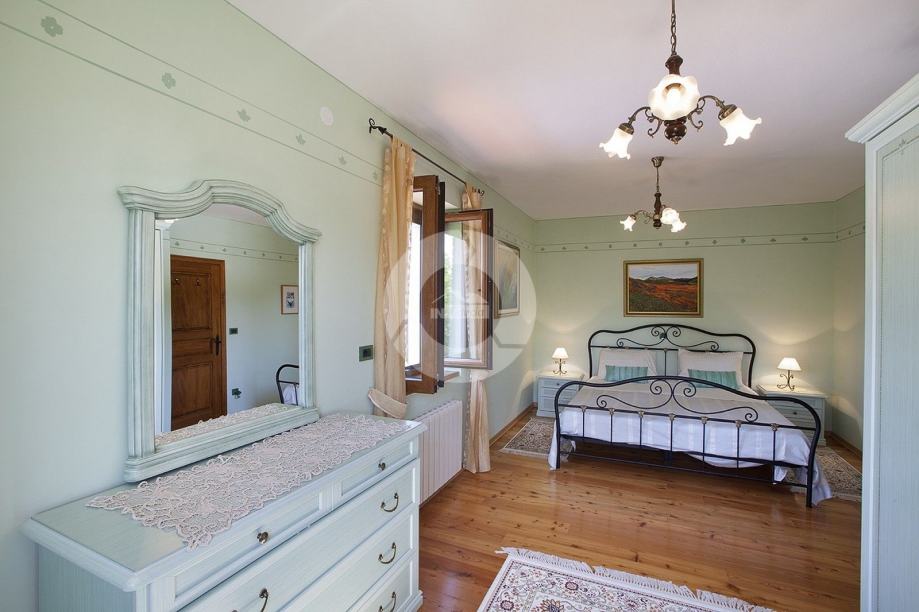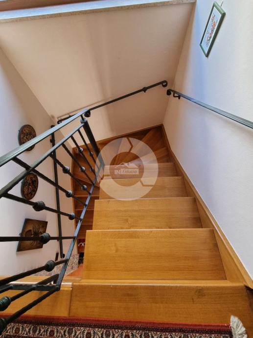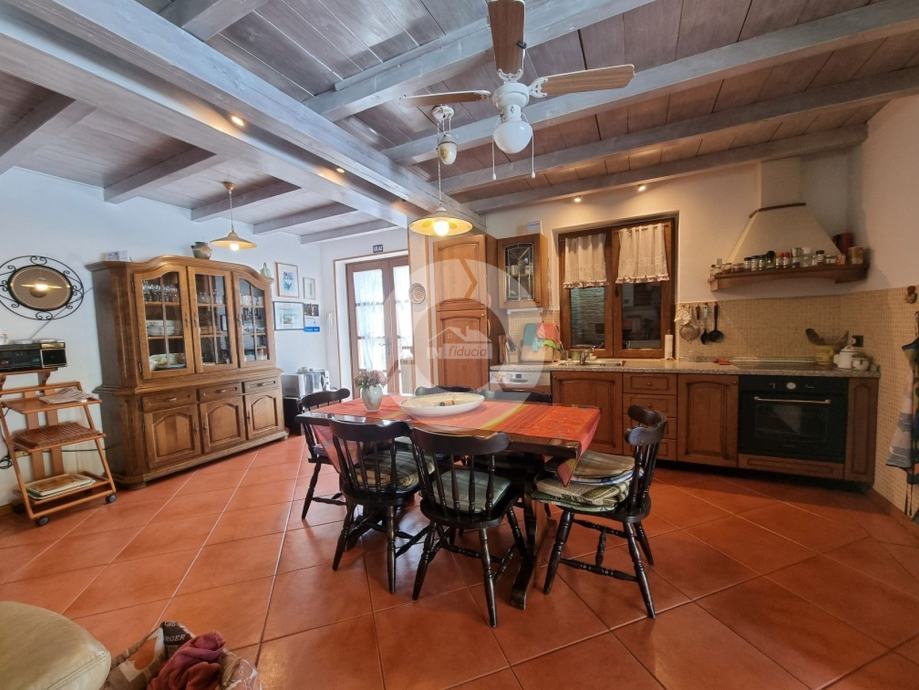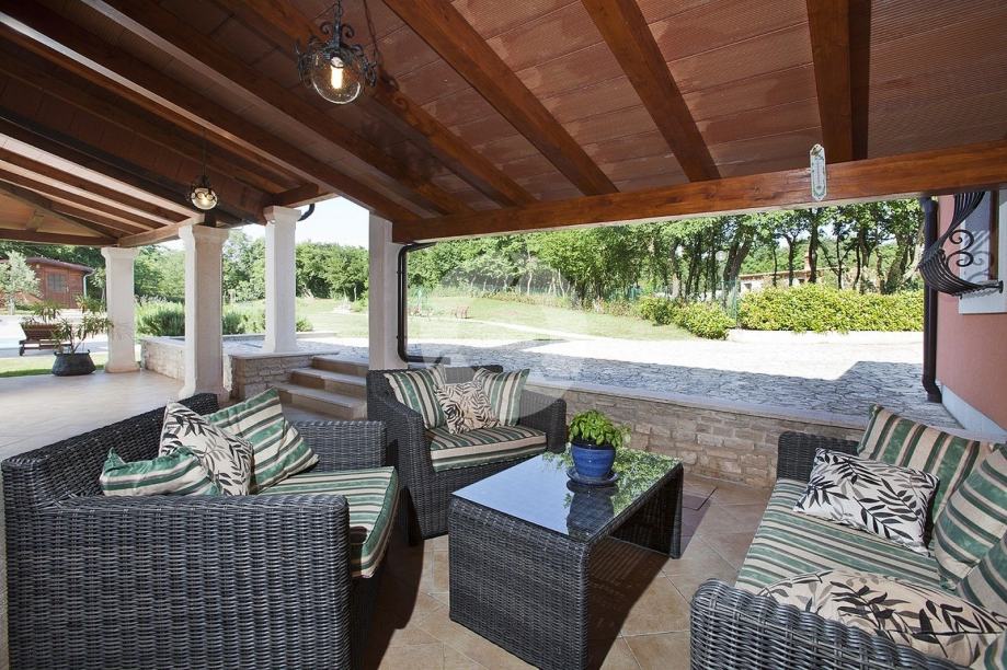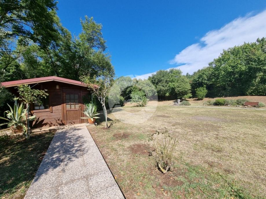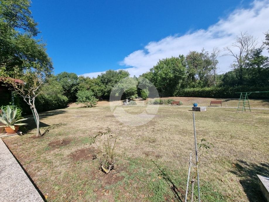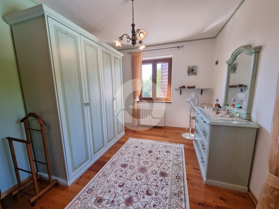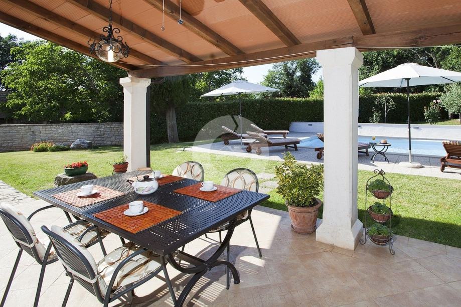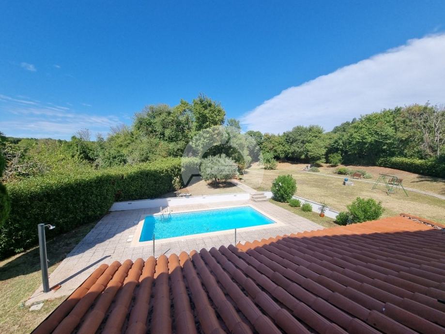 Prekrasna kuća s bazenom nalazi se u okolici poznatog istarskog gradića Barban (cca 6 km), u jednom malom mjestu udaljenom svega 2 km od mora. Kuću krasi upravo lokacija koja pruža maksimalnu privatnost i mirnoću, te veličina zemljišta na kojoj se kuća nalazi- 2200 m2, odnosno okućnice 2020 m2. Sagrađena je 2008. godine, te kompletno opremljena namještajem i tehnikom. Sastoji se od prizemlja i kata. U prizemlju se nalazi hodnik, kuhinja, blagovaona, dnevni boravak s kaminom i vrata za izlazak na veliku natkrivenu terasu gdje se nalazi još jedan kamin. U prizemlju se još nalazi jedna spavaća soba, kupaona, te spremište/praona, radionica, kotlovnica i garaža. Unutarnjim drvenim stepenicama se odlazi na kat gdje su smještene tri spavaće sobe (dvije velike sobe i jedna manja) i velika kupaona. Kuća je opremljena kvalitetnim namještajem, keramikom i sanitarijama. Ima centralni sustav za grijanje na naftu, peć na pelete i kamin. Ima prilaz kući sa dvije strane što je njezina prednost jer se drugi dio parcele od 1342 m2 može iskoristiti kao građevinsko zemljšite za eventualni drugi objekat, ne vezano za glavnu kuću. Okućnica je uređena, kompletan teren je ograđen djelomično kamenim zidom, djelomično visokom živicom, tako da garantira privatnost. Vrt ima navodnjavanje i bazen od 32 m2 sa sunčalištem, te cisternu. Također u vrtu postoji drvena kućica u kojoj se nalazi strojarnica bazena. Kuća je idealan izbor kao kuća za iznajmljivanje ili kao obiteljska kuća.