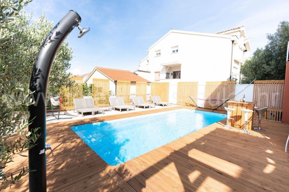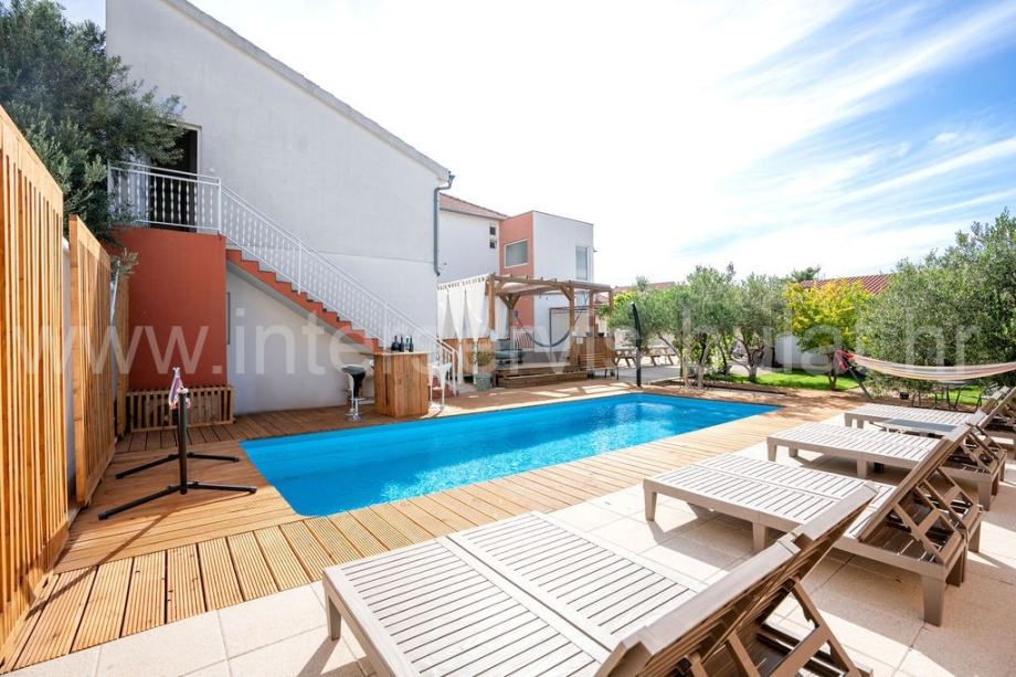 U predivno koncipiranom dvorištu smješten je bazen dimenzija 9m x 3,6m, sunčalište s vanjskim tušem i mnoštvo mediteranskog bilja u vrtu. Osiguran je parkirni prostor.
