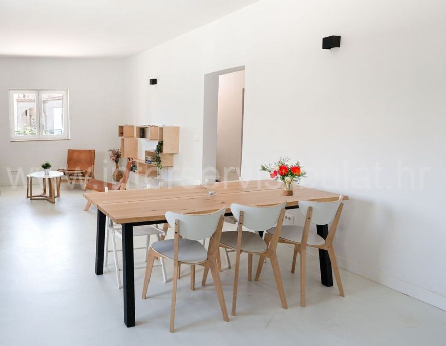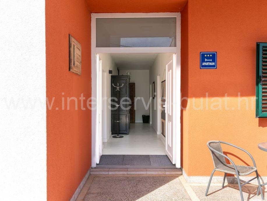 Glavna nekretnina, kuća s 320m2 stambene površine sastoji se od prizemlja i kata te krova. U prizemlju je trosoban stan s komfornim dnevnim boravkom. Unutarnje stubište vodi na kat gdje se nalazi drugi trosobni stan s balkonom. Svaka soba ima vlastitu kupaonicu.