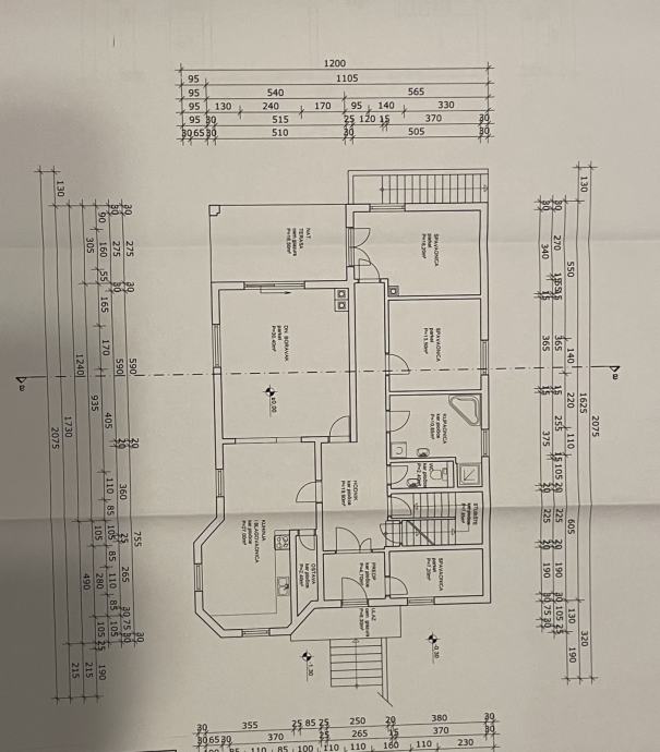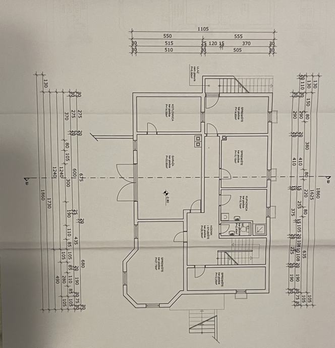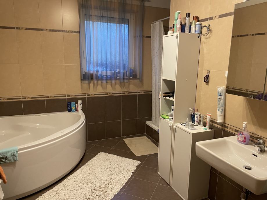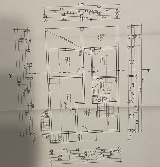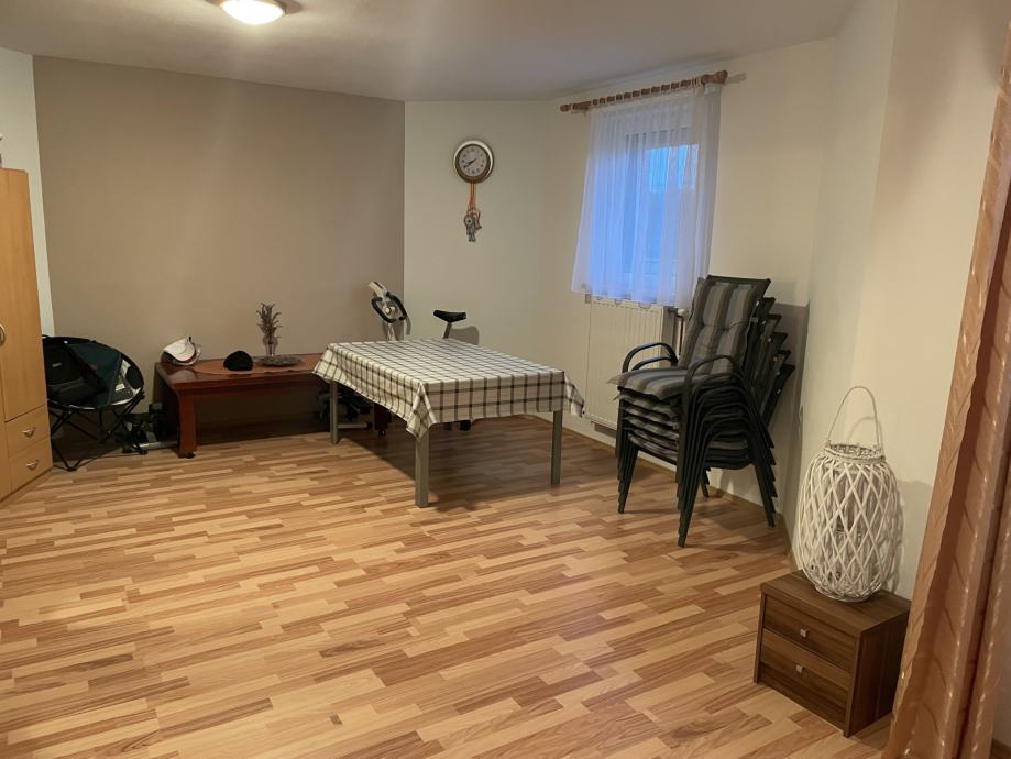 - Suterena/podruma u kojem se nalaze: velika soba, manja soba, wc, kupaona, garaža, konoba, kotlovnica, ostava. Površina 163,45m2