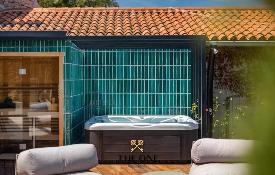 Vanjski prostor uređen je s posebnom pažnjom – s prirodnim kamenom, šljunkovitim stazama i mirisnim mediteranskim biljem. Središnji dio čini grijani bazen od 28 m² sa slanom vodom, okružen ležaljkama za uživanje na suncu. Tu je i wellness zona s finskom saunom i hidromasažnom kadom koja pruža potpunu relaksaciju.