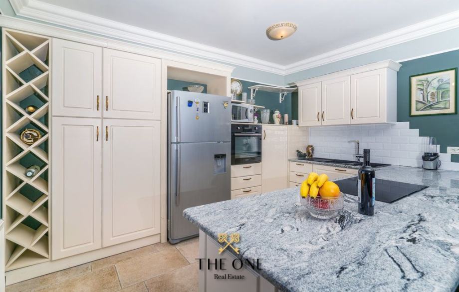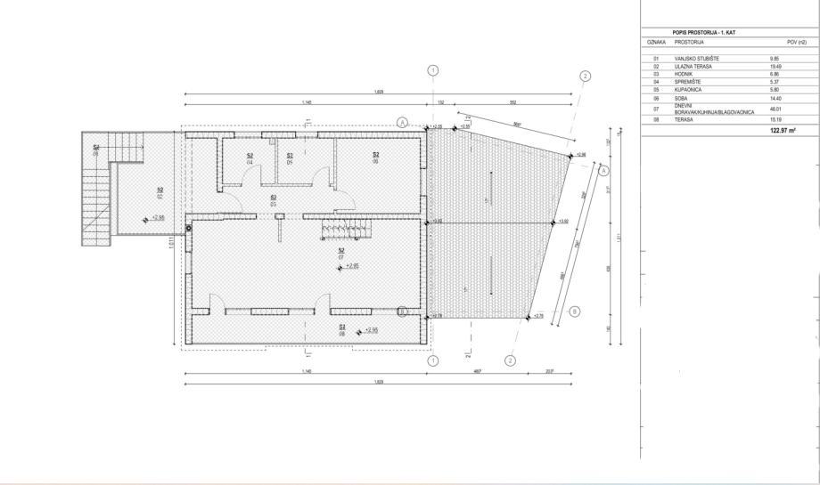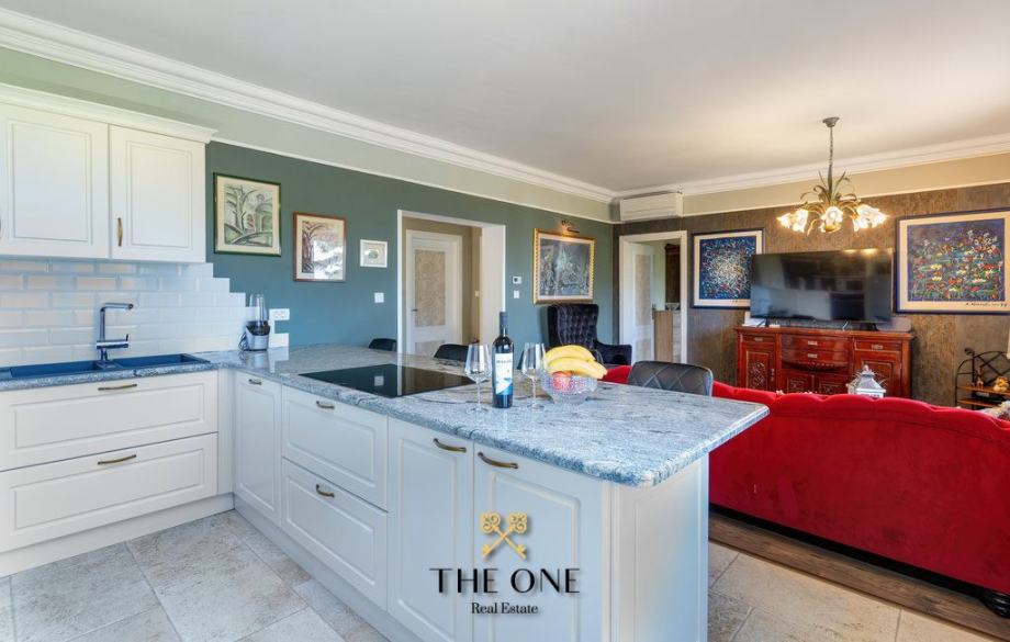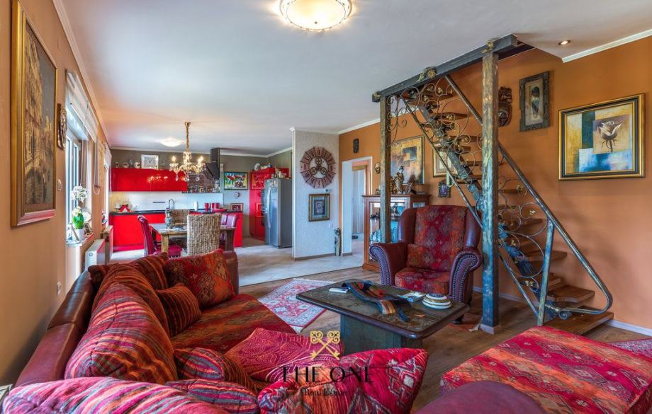 Vanjske stepenice vode na prvi kat gdje se nalazi dvoetažni stan. Natkrivena terasa uvodi u hodnik te u otvoreni koncept dnevnog dijela stana koji se sastoji od dnevnog boravka, kuhinje i blagovaonice. Iz dnevnog boravka se izlazi na balkon s kojeg se pruža prekrasan pogled na okolicu i more.