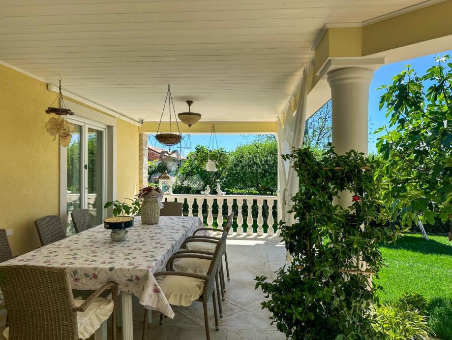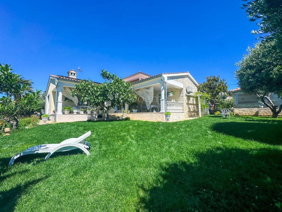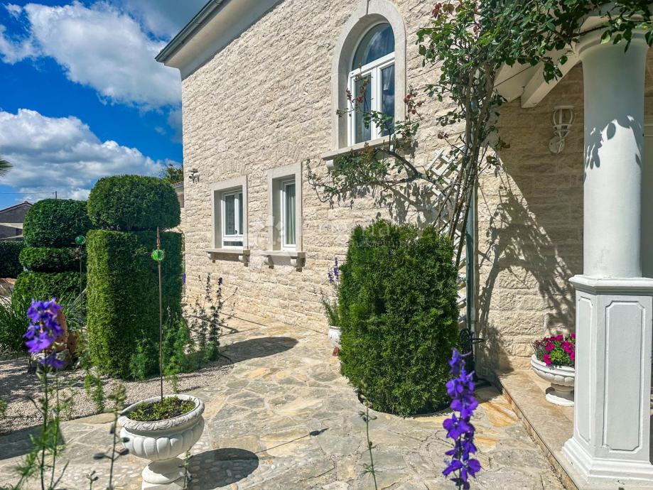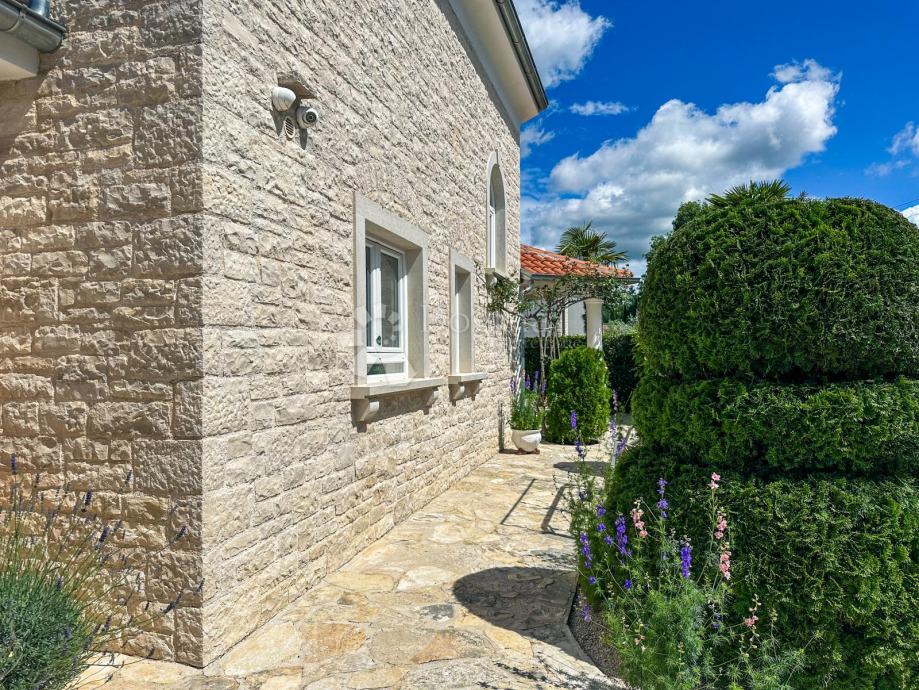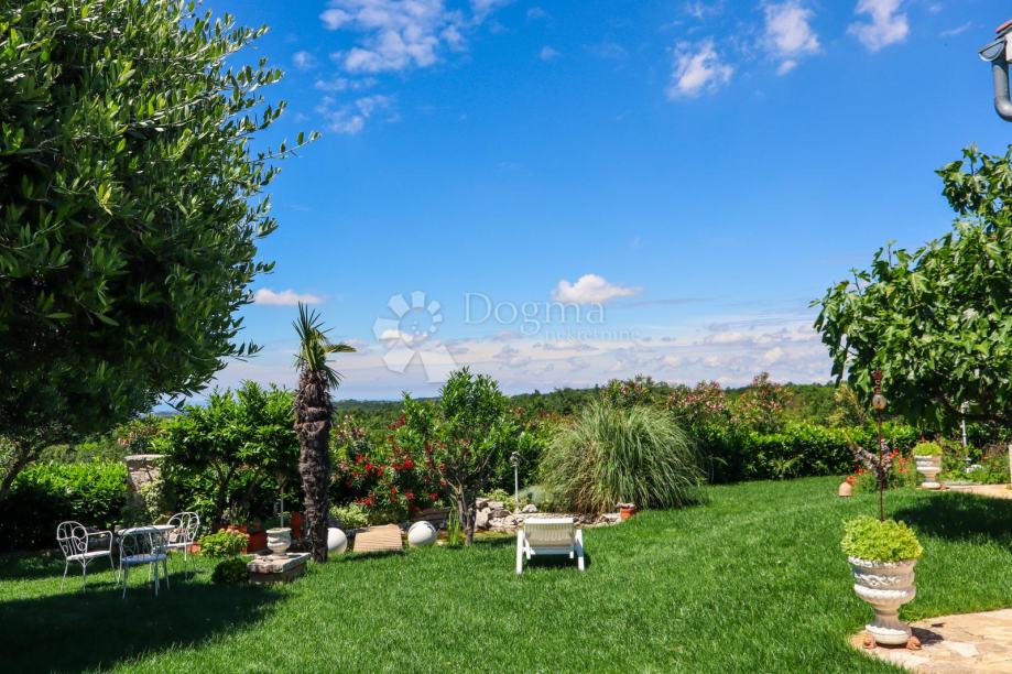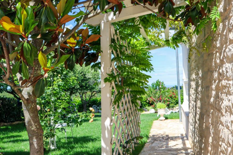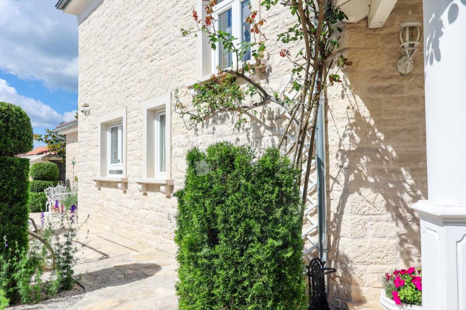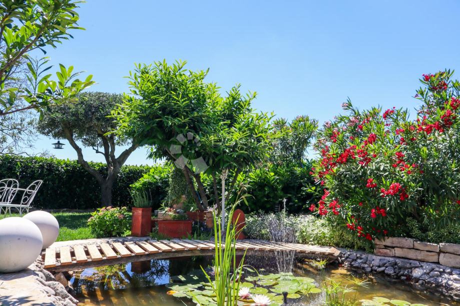 Okućnica je uređena kao zeleni vrt sa maslinama, cvijećem te jezercem sa fortanom. Travnjak i živica oko cijele parcele ima instalacije za automatsko navodnjavanje.