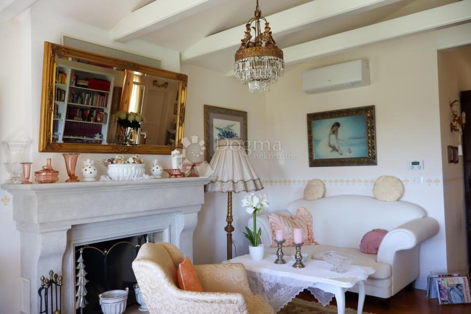 Prizemlje se sastoji od kuhinje sa ostavom, blagovaone, dnevnog boravka kojeg krasi kamin, spavaća soba sa kupaonicom, gostinjski toalet. Uređenim stepenicama sa drvenim gazištem dolazimo na 1. kat gdje su smještene 2 spavaće sobe (jedna veća 16 m2 sa izlazom na terasu sa koje se ponovo pruža prekrasan otvoren pogled prema moru, i jedna manja 9m2) te još jedna kupaonica.