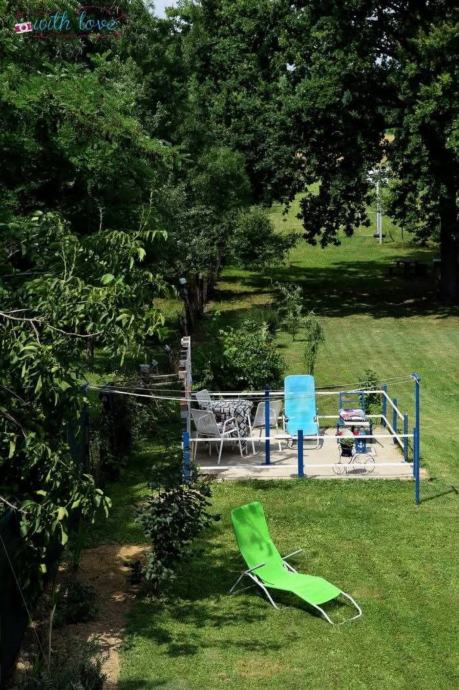 Kuća se nalazi na prostranoj parceli od čak 2100 m², okruženoj zelenilom i prirodom. Poseban ugođaj stvaraju dva stoljetna hrasta pod kojima se često mogu vidjeti vjeverice, ptice, ježevi, pa čak i srne zahvaljujući blizini rijeke Karašice (udaljene svega 500 m). U dvorištu se nalazi voćnjak, površina pogodna za poljoprivredu, ljetna terasa, ložište i roštilj – idealno za obiteljska okupljanja i druženja.