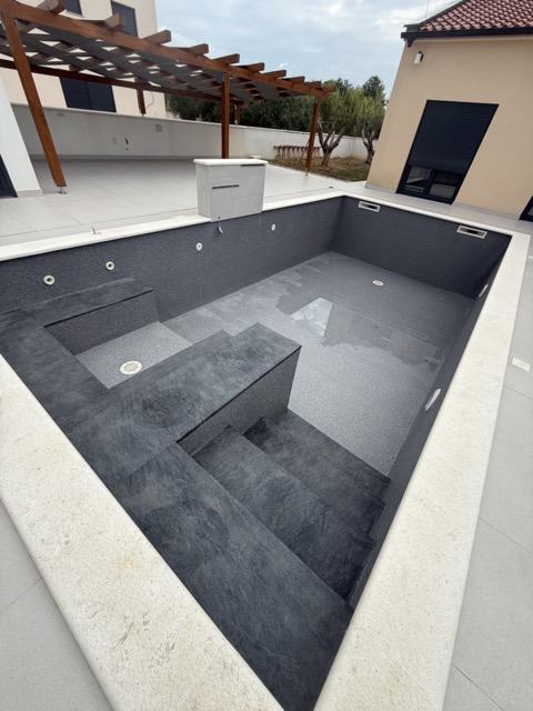 U središtu dvorišta nalazi se bazen dimenzija 8x4 m s integriranim jacuzzijem, okružen sunčalištem i popločanim terasama. Tu su i vanjski roštilj sa spremištem te dovoljno prostora za druženje i uživanje na otvorenom.