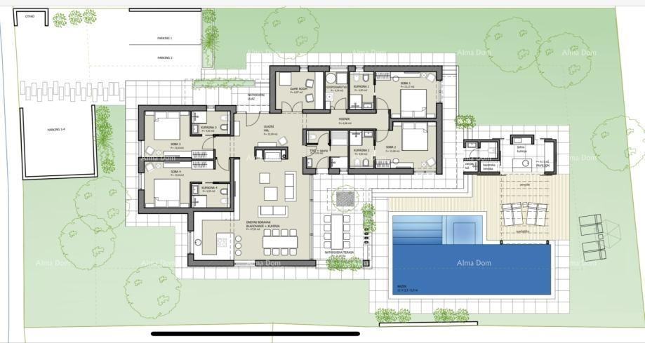 Vila ima sedam spavaćih soba, veliki prekrasni dnevni boravak s izlazom na bazen koji je dimenzija 11x 5.5 m2. Sva stakla u kući su troslojna punjena plinom. U vrtu je ljetna kuhinja 12 m2 velika.