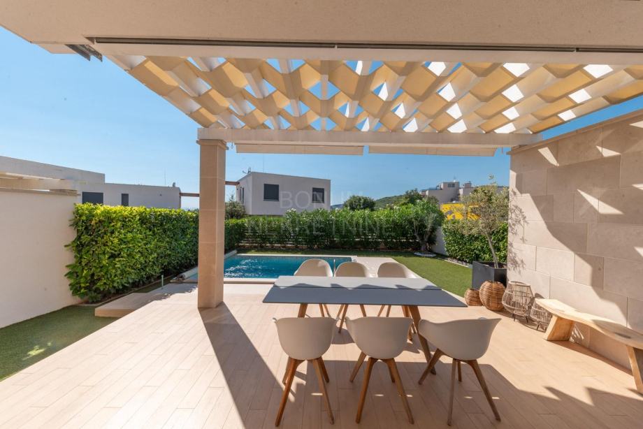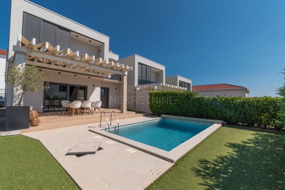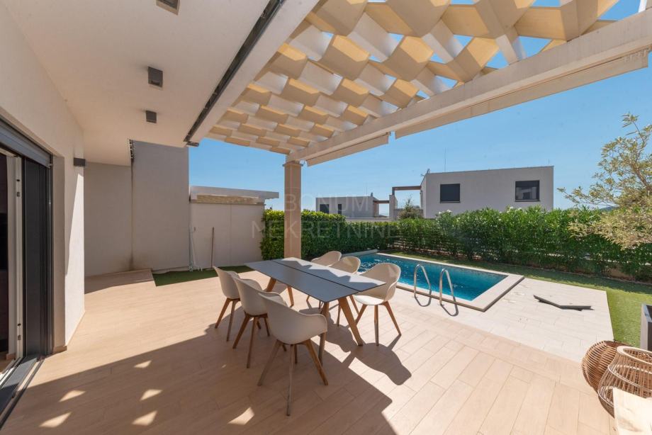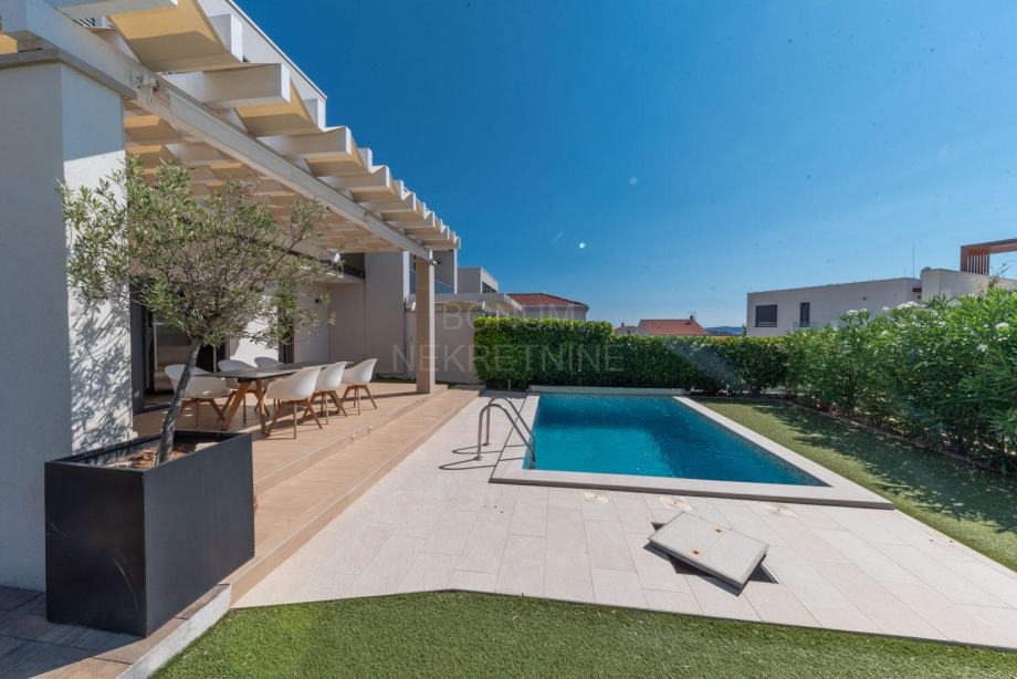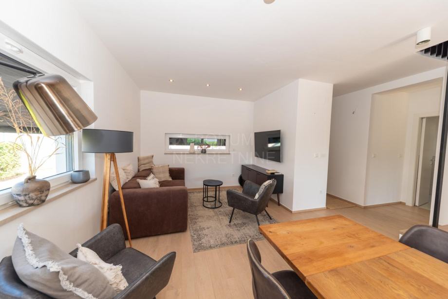 Posebnu vrijednost daje pripadajući vanjski prostor površine 259,06 m² koji uključuje uređeno dvorište, prostor za sunčanje, terasu uz bazen, sam bazen za uživanje u toplim ljetnim danima, vrt te dva parkirna mjesta. Cijela nekretnina je pažljivo uređena kvalitetnim namještajem i opremom, te pruža visoki standard stanovanja.