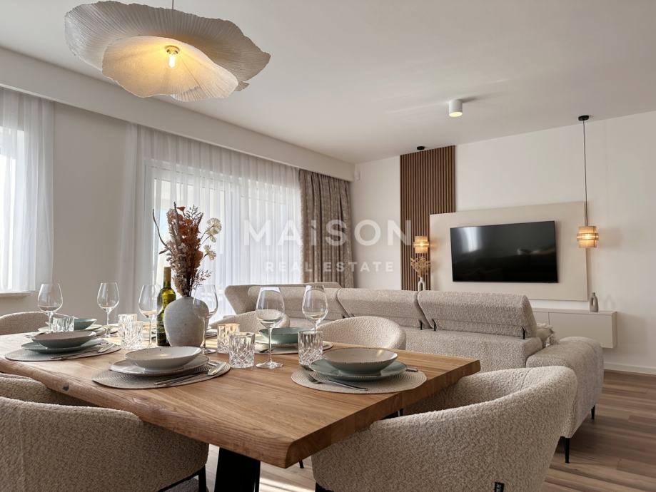 Raspoređena na dvije etaže, vila svojim funkcionalnim tlocrtom omogućuje savršen sklad između estetike i praktičnosti. Prizemlje je dizajnirano kao prostrani dnevni prostor ispunjen prirodnim svjetlom, s moderno opremljenom kuhinjom i blagovaonicom koje vode na natkrivenu terasu – idealno mjesto za opuštanje i uživanje u pogledu na prekrasnu prirodu. Na ovoj etaži smješteni su i elegantna kupaonica te dva praktična spremišta, a unutarnji raspored pomno je osmišljen kako bi osigurao maksimalnu udobnost. Prvi kat rezerviran je za privatni dio vile, gdje se nalaze tri prostrane spavaće sobe, svaka s vlastitom kupaonicom i walk-in tušem. Suvremeni dizajn interijera odiše profinjenošću, a svaka prostorija opremljena je vrhunskim materijalima i pomno biranim detaljima kako bi pružila osjećaj luksuza i udobnosti.