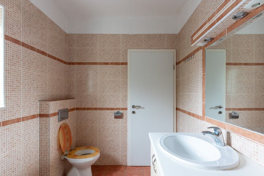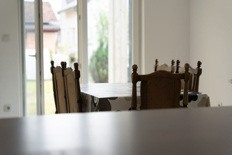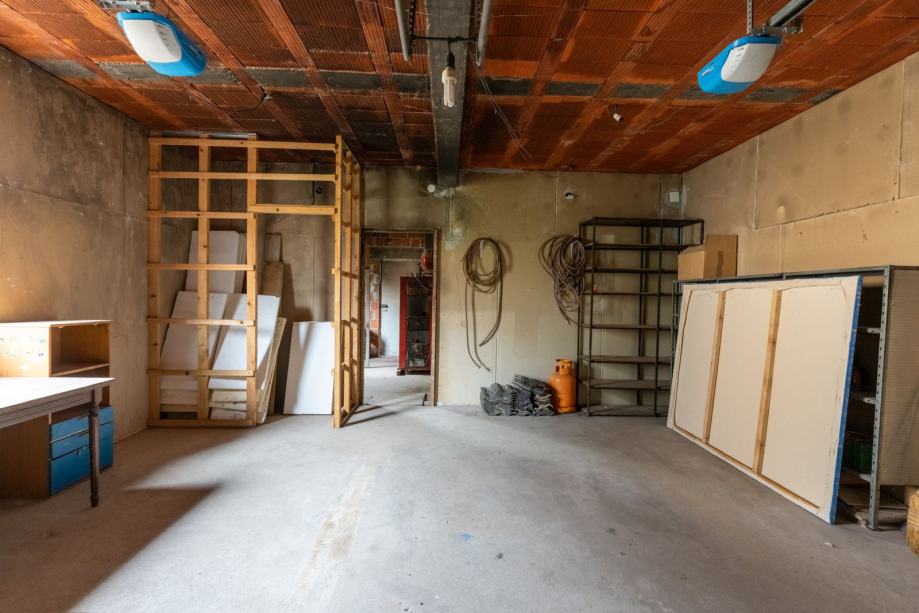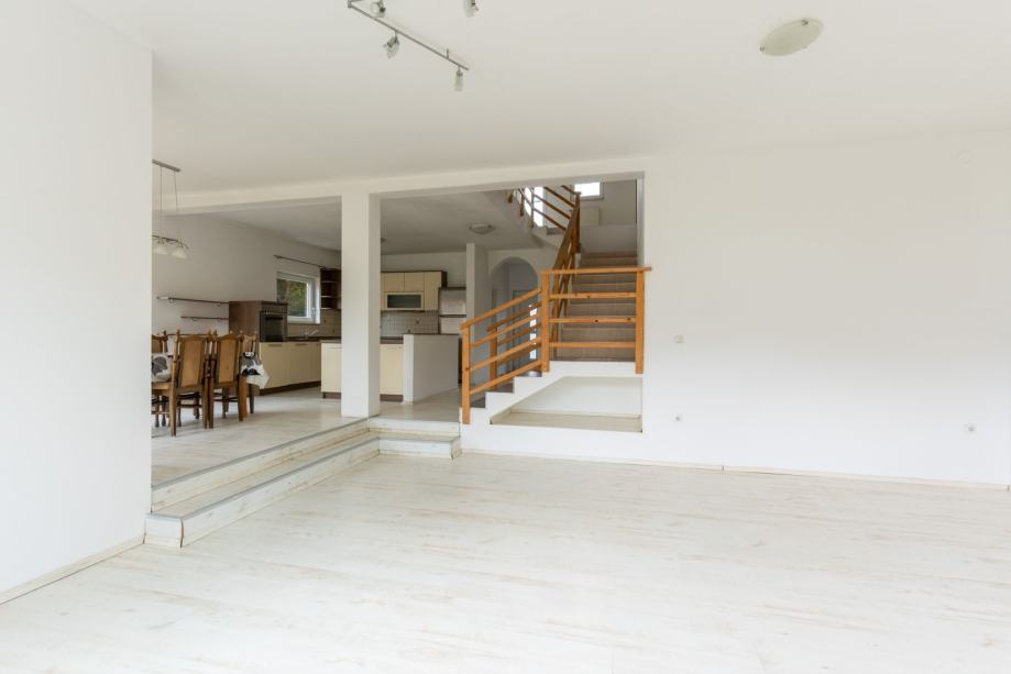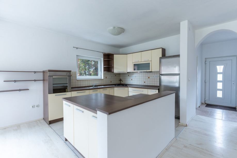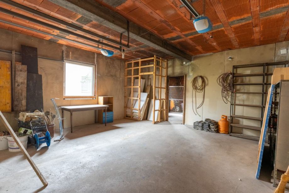 Otvoreni prostor prizemlja sastoji se od kupaone, hodnika, spremišta, nove ugradbene kuhinje s otokom, blagovaone i prostranog dnevnog boravka sa izlazom na dvorište. Garaži s dva parkirna mjesta se može pristupiti iz hodnika ili kroz vanjski ulaz na dupla vrata na električni pogon. U produžetku garaže se nalazi peć za centralno grijanje na drva, ali je moguće spojiti se na plin. Ispred kuće je pet parkirnih mjesta.