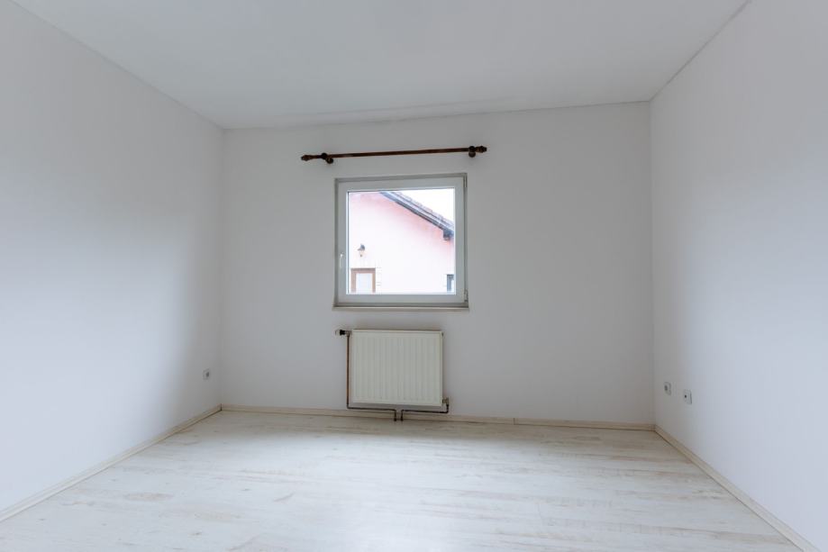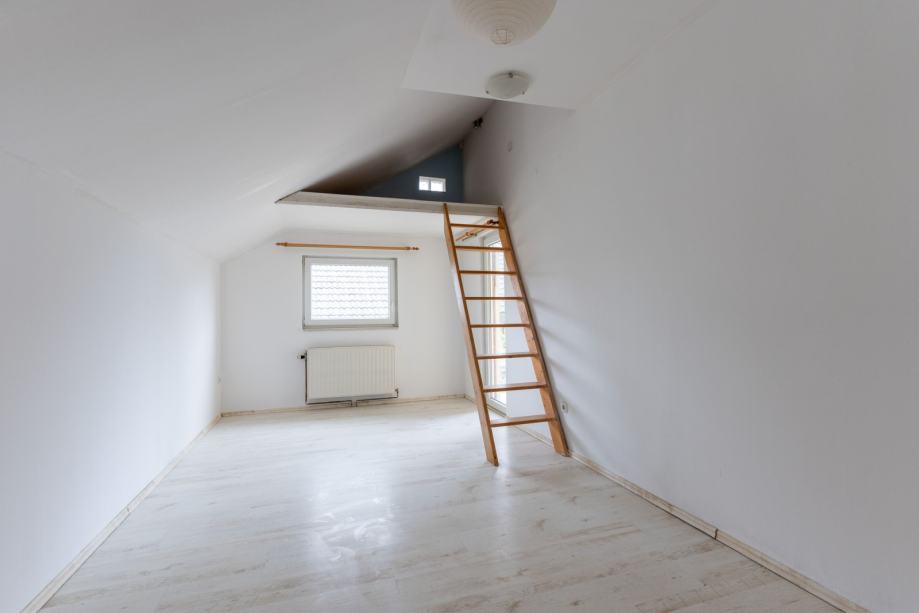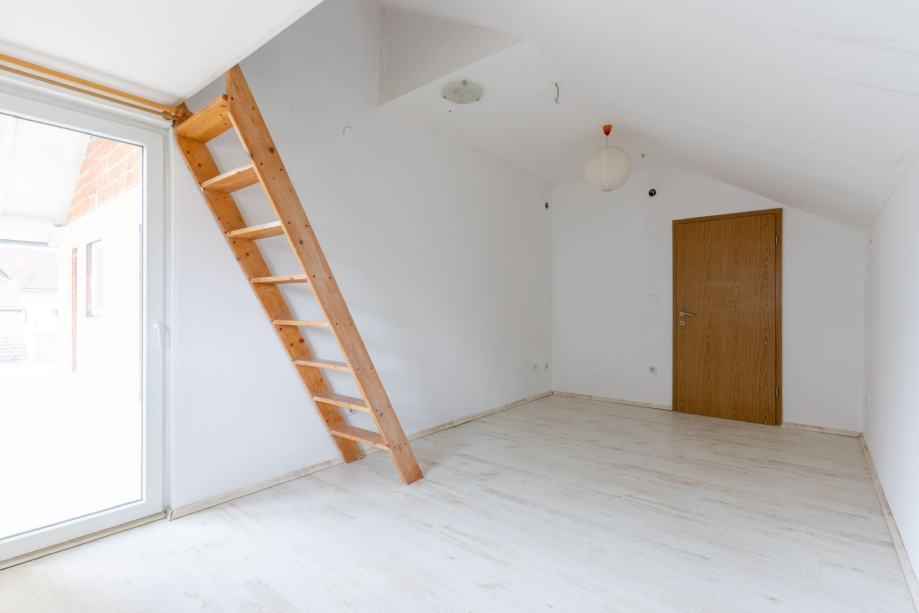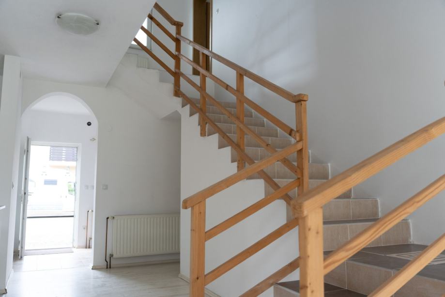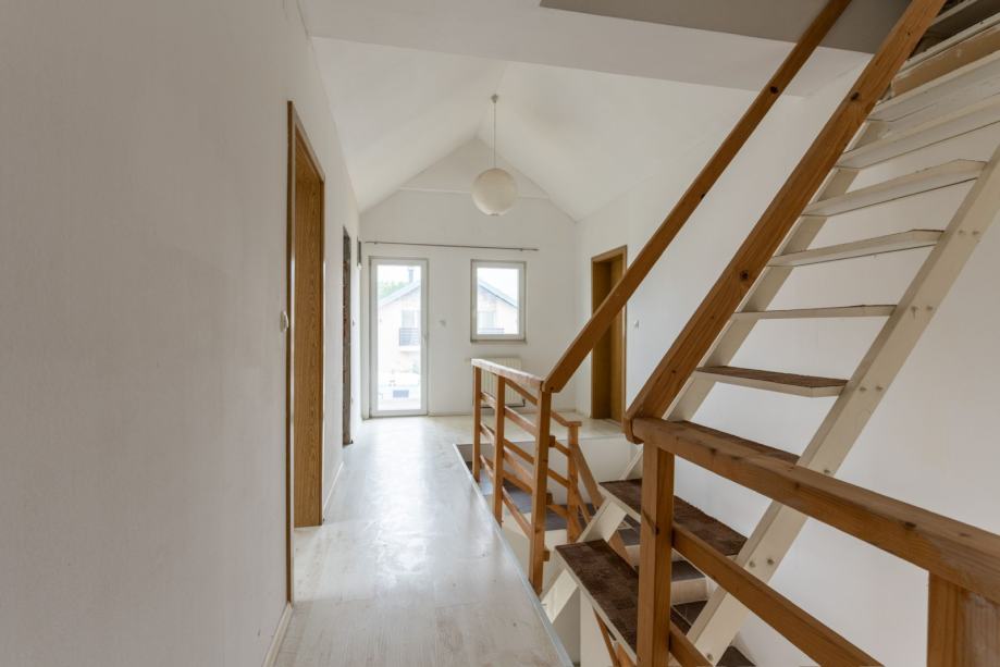 Na prvom katu nalazi se pet spavaćih soba od kojih četiri imaju izlaz na natkriveni balkon, glavna spavaća soba sadrži walk-in ormar, a jedna od soba ima i ugrađenu galeriju. Uz to, prvi kat sadrži kupaonicu u izgradnji sa pripadajućim instalacijama i stubište koje vodi na prostrani roh bau tavan. PVC prozori su postavljeni po cijelom objektu.