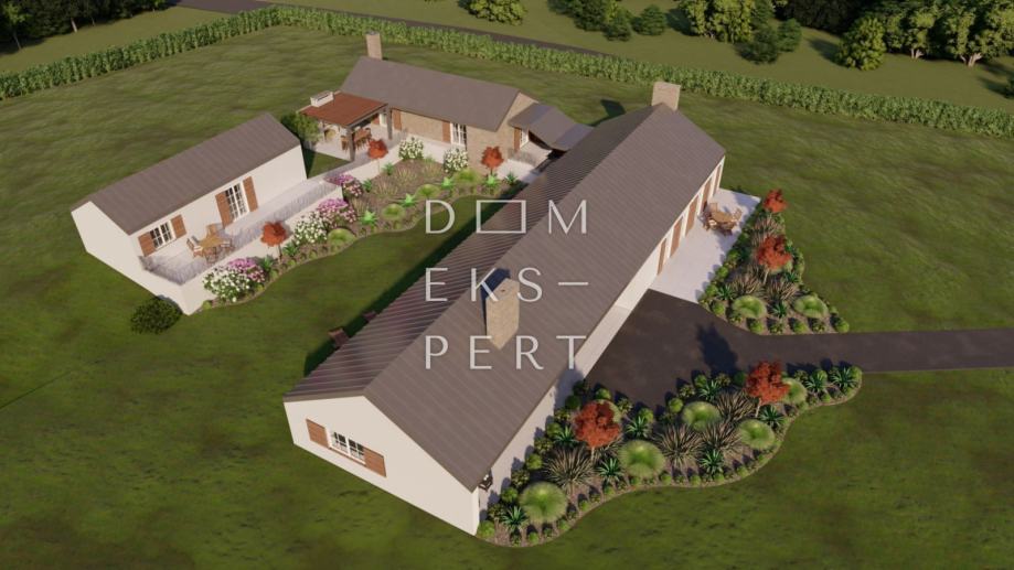 Kompleks je osmišljen u obliku slova U, a sastoji se od kuće za stanovanje (208,95m²), pomoćnih prostorija (radionice 21,92m², vešeraja 29,60m²), sjenice s roštiljem (10,63 m²) i gostinjske kuće (46,18m²).