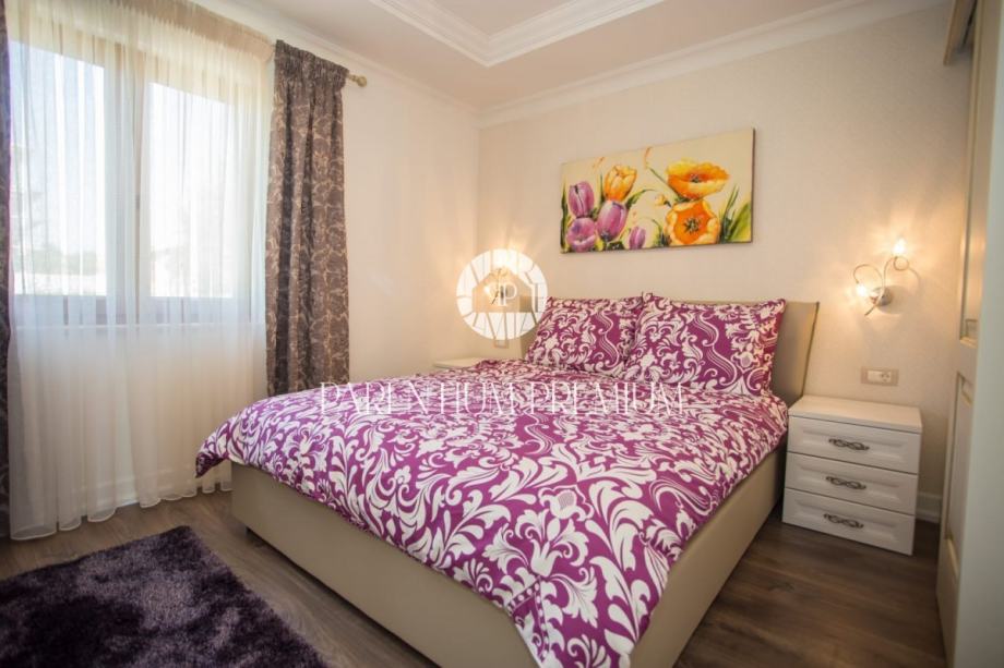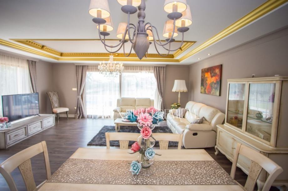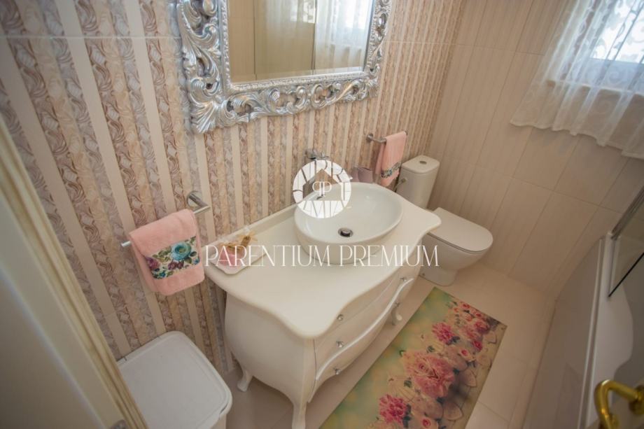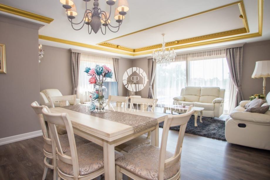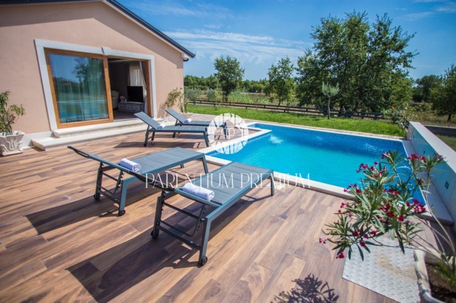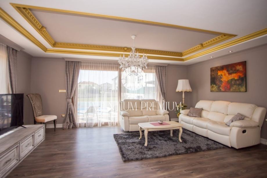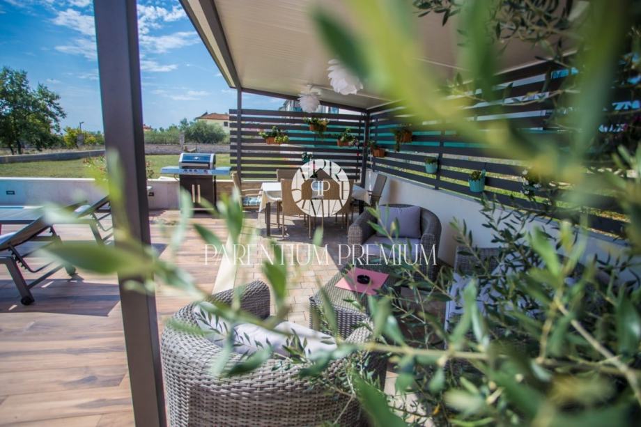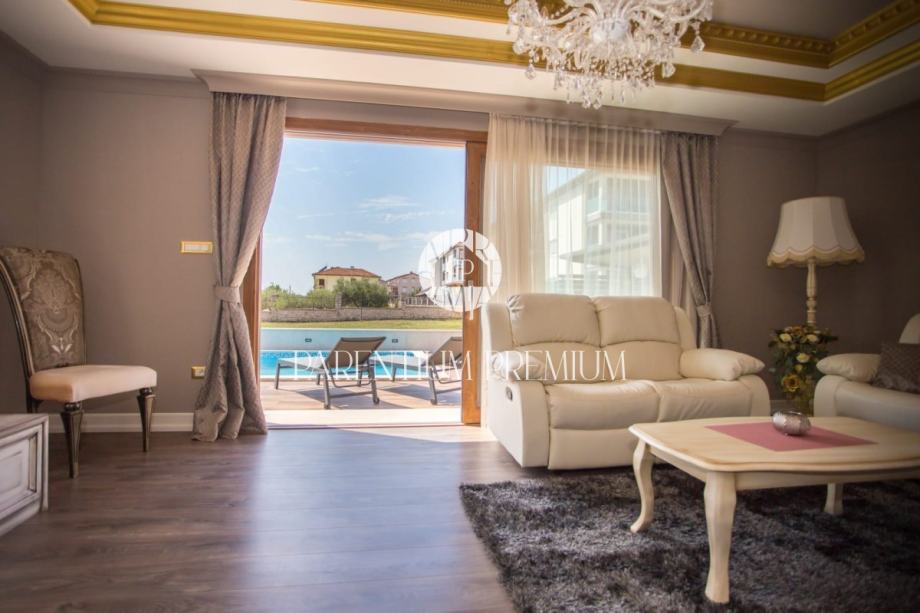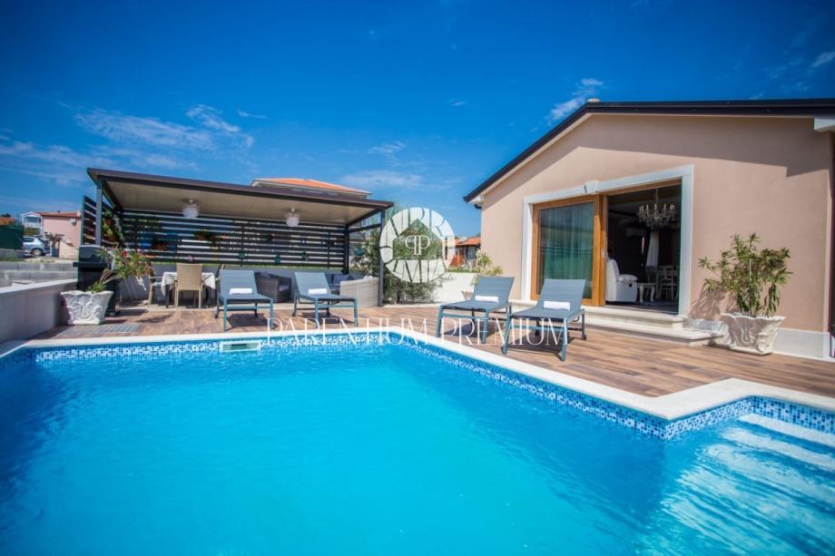 Iz dnevnog boravka se izlazi na terasu koja vodi na lijepo uređenu okućnicu na kojoj se nalazi bazen sa kupalištem.