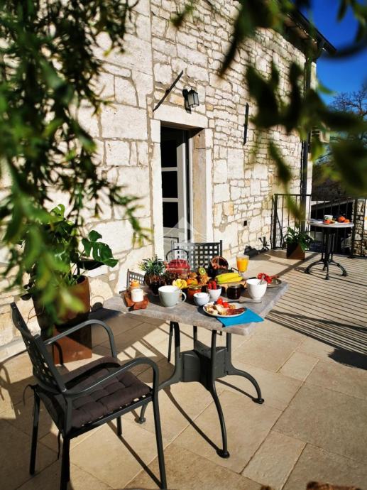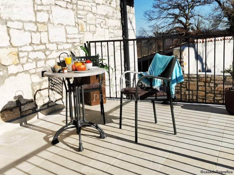 Tradicionalni istarski "baladur" krasi ulaz u kuću, a nekoliko terasa u dvorištu su diskretno raspoređene kako bi se osigurala privatnost i prostor za uživanje.