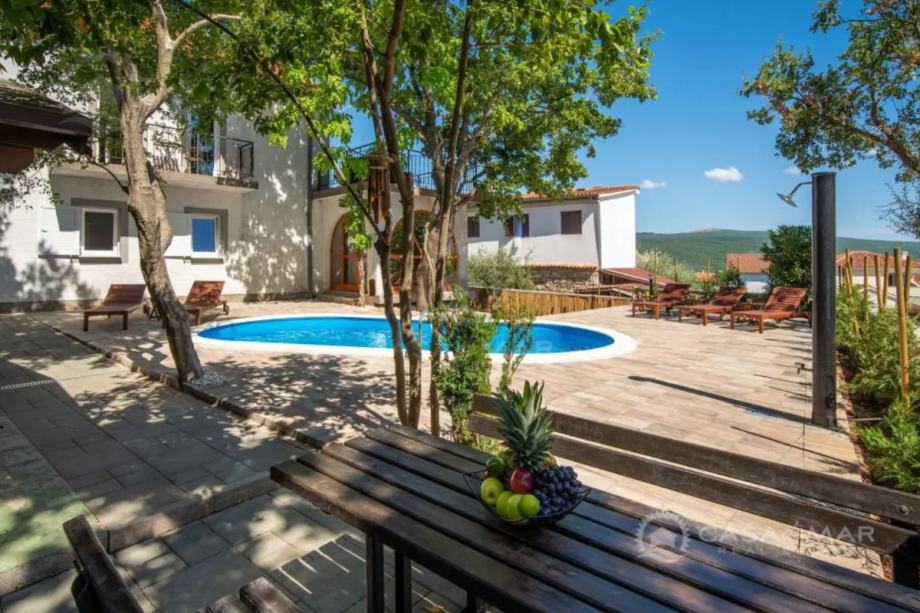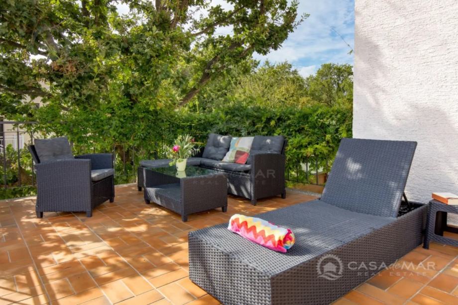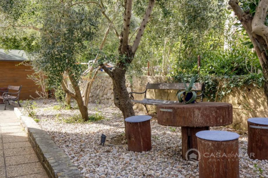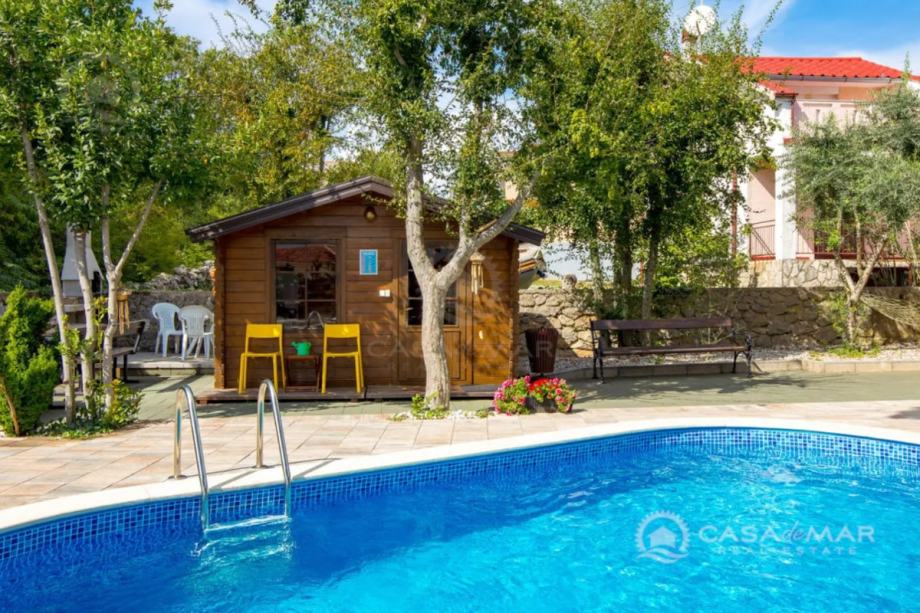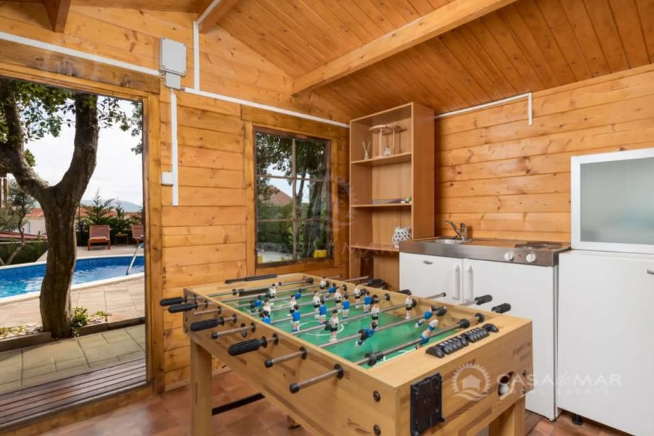 Okućnica je uređena za uživanje – opremljena je bazenom, sunčalištem, roštiljem i vrtnom kućicom sa stolnim nogometom u kojoj se također nalazi i ljetna kuhinja. Na raspolaganju su i četiri parkirna mjesta te garaža koja se nalazi u suterenu kuće.