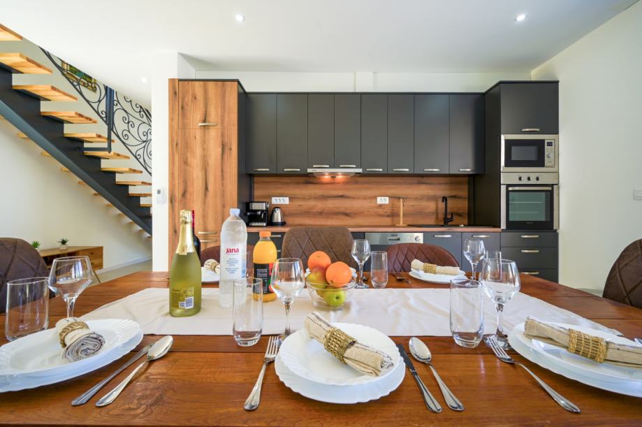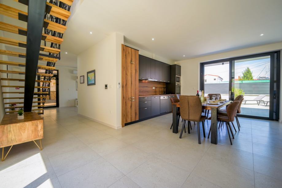 Vila ima jasnu granicu i omeđena je kamenom ogradom kako bi se osigurala privatnost. Sastoji se od prizemlja gdje se nalazi veći ulazni dio, kupaonica sa vešerajem, pomoćna prostorija, hodnik, kuhinje i velike blagavaonice sa dnevnim boravkom. Unutarnjim stepeništem dolazite do prvog kata gdje su se smjestile ukupno četiri spavaće sobe od kojih tri imaju veliki bračni krevet.