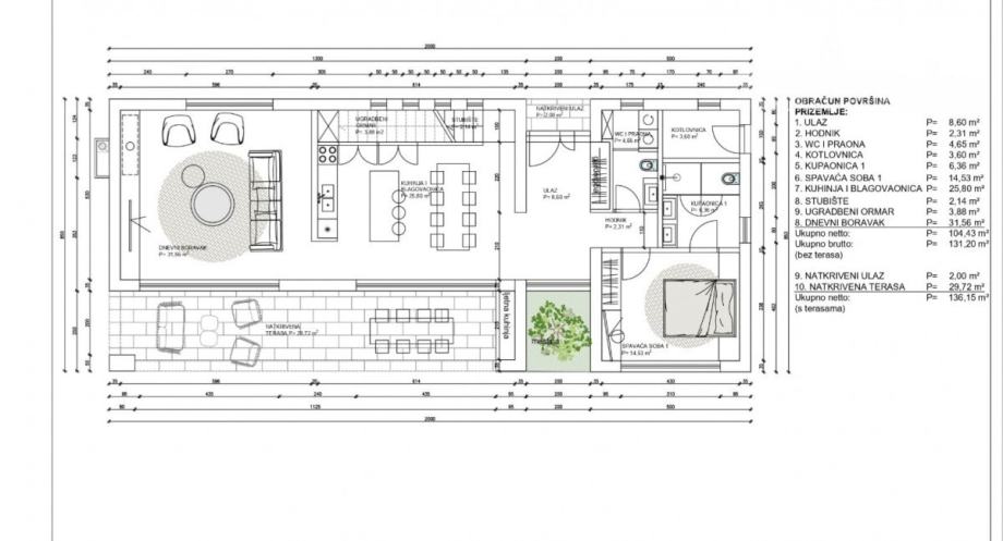 Prizemlje će se sastojati od ulaznog hodnika, dnevnog boravka sa kuhinjom i blagovaonicom, kotlovnica, praonica, spavaća soba sa privatnom kupaonom, dodatni wc za goste te natkrivena terasa od cca. 30 m2 na kojoj će se nalaziti ljetna kuhinja.