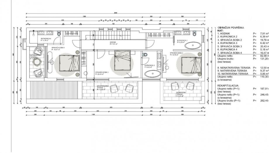 Vila ima ukupno neto površinu sa terasama 249,50m2, a nalazi se na parceli od 1026 m2.