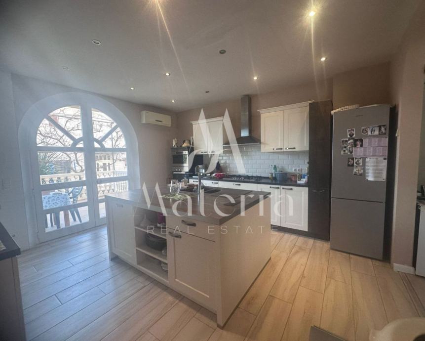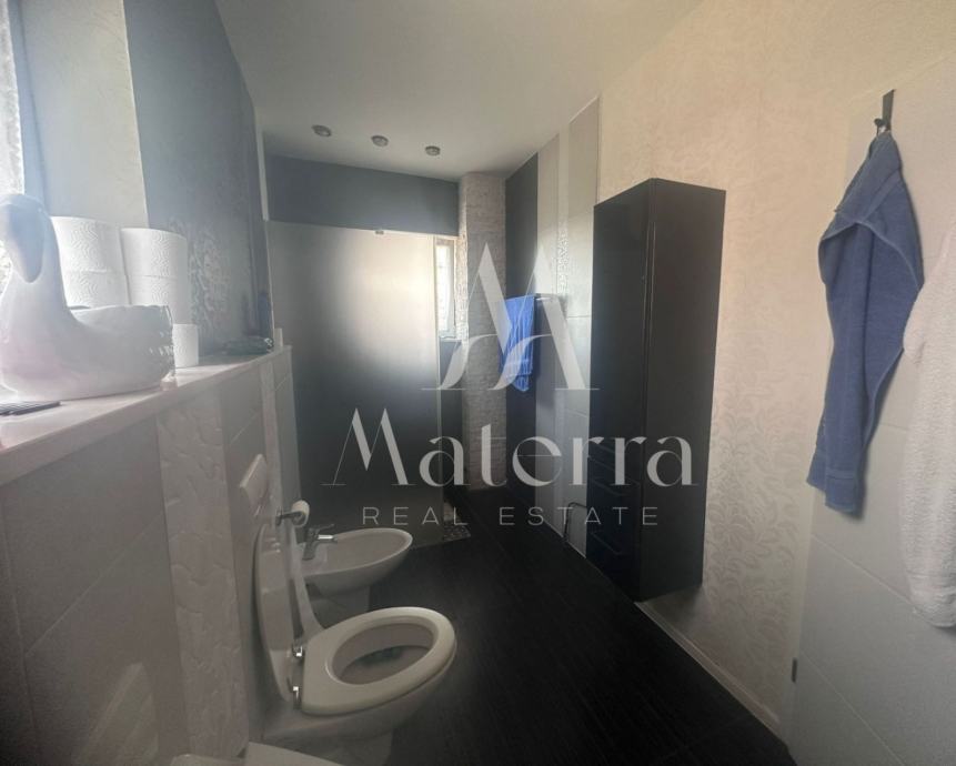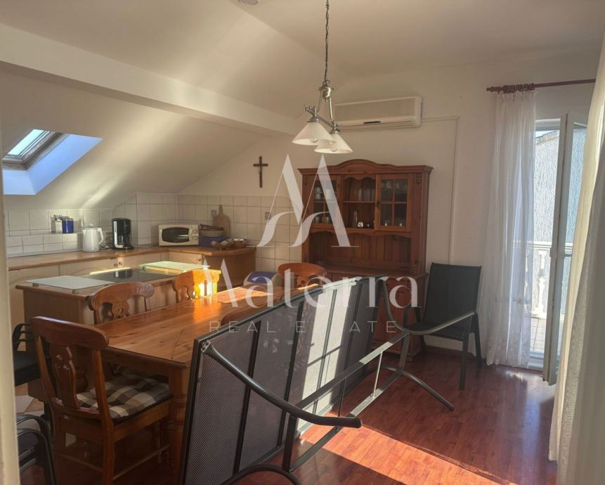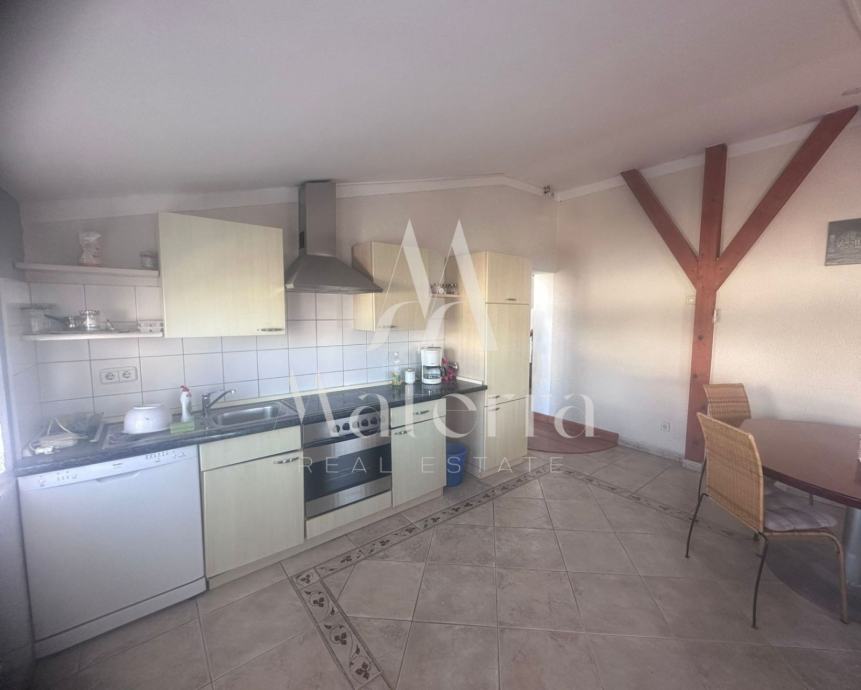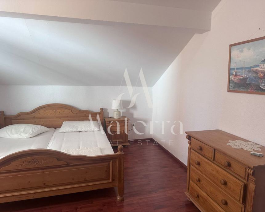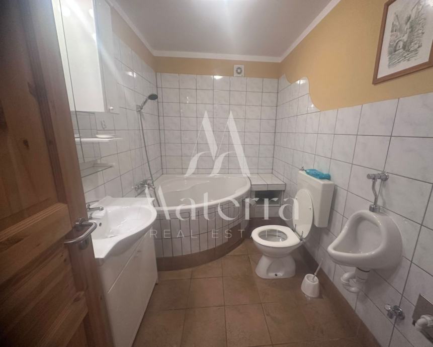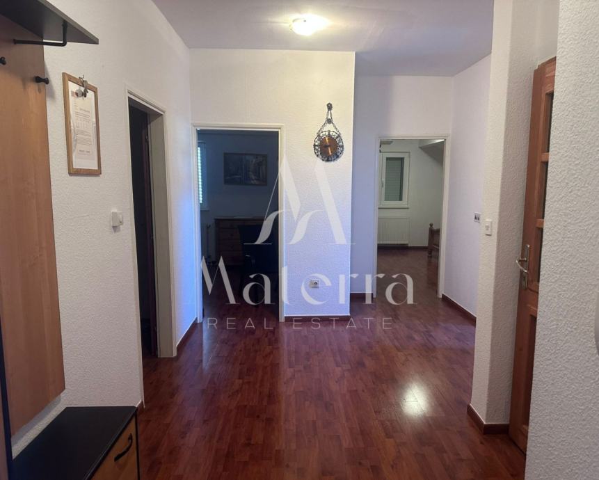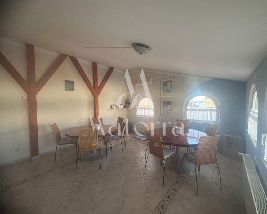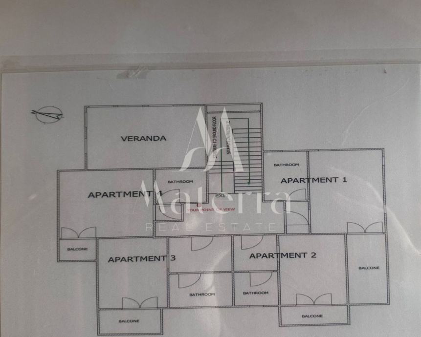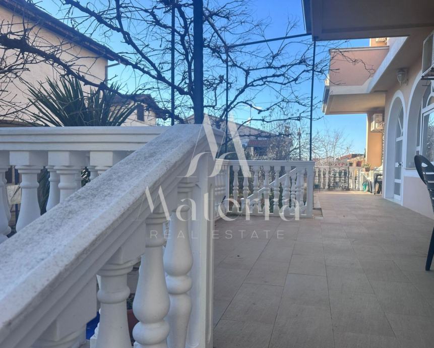 Sastoji se od tri etaže. Na prvoj etaži se nalazi komforni stan koji se sastoji od predsoblja, tri spavaće sobe, dvije kupaonice, prostranog dnevnog boravka, kuhinje s otokom i terase. Na drugoj etaži se nalaze četiri studio apartmana i veranda za zajednički boravak i druženje. Svaki od studio apartmana ima i svoj balkon. Na trećoj etaži, u potkrovlju, je veliki apartman s tri spavaće sobe, kupaonicom, kuhinjom i tri balkona. Iza kuće se nalazi prostrani parking i kamin, a ispred kuće vrt. Kuća je opremljena s centralnim grijanjem - lož ulje, klimatizacijom, solarni paneli i spremnik 600L tople vode. Prodaje kompletno namještena i opremljena, spremna za useljenje i najam.