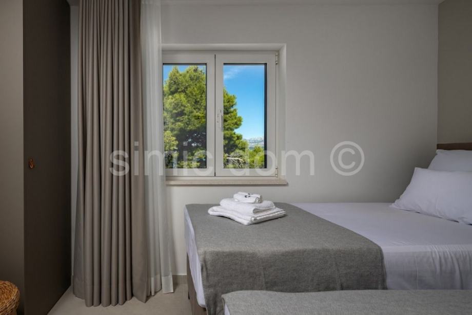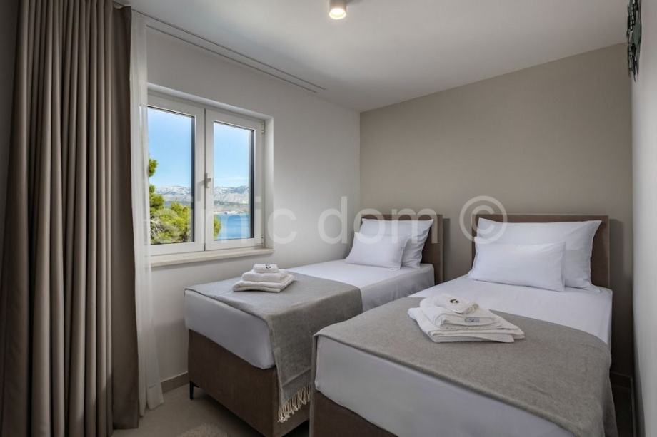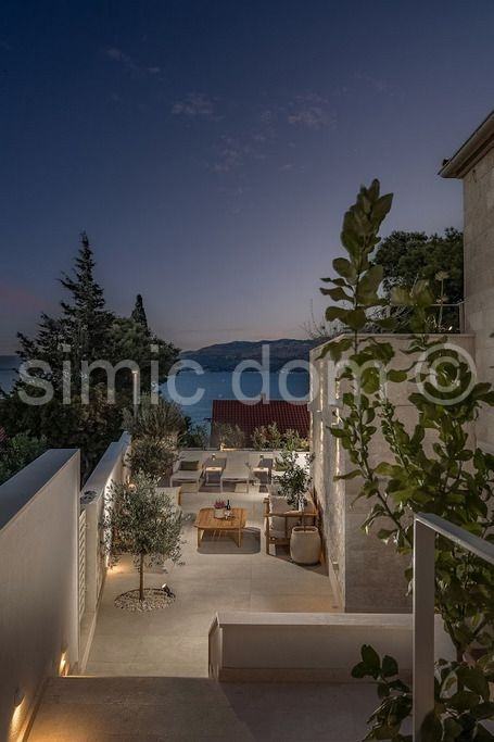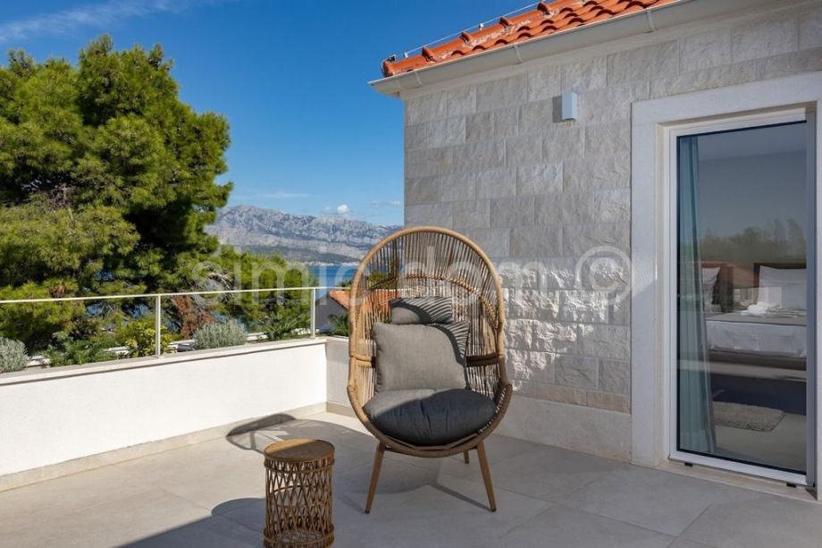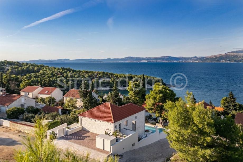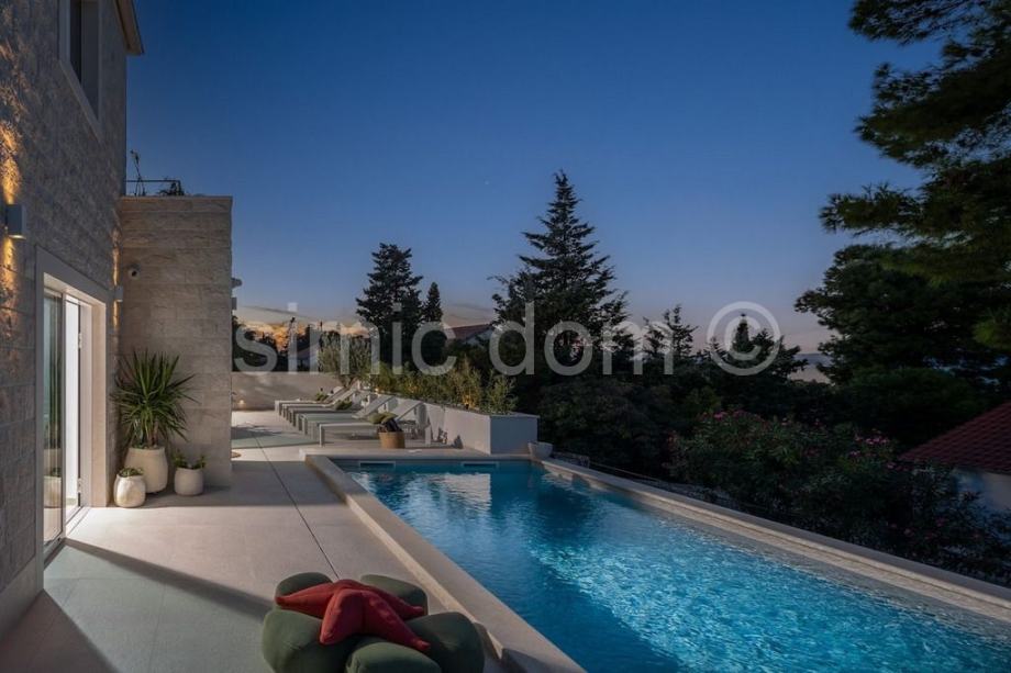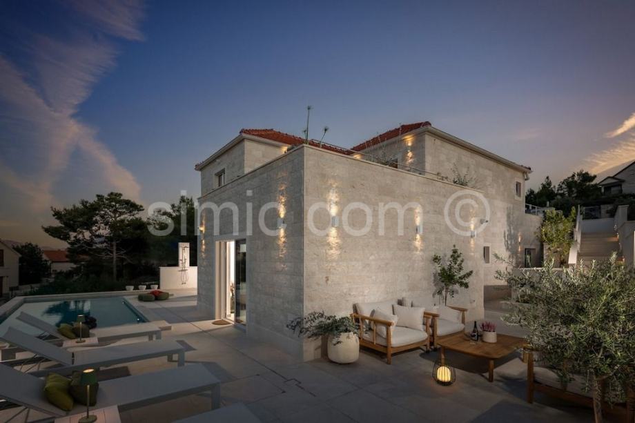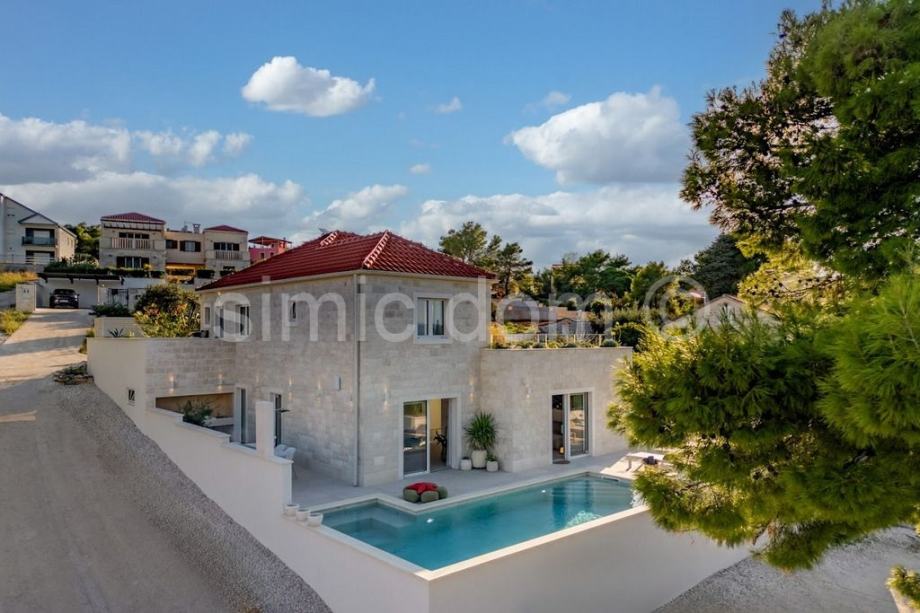 Na prodaju je divna nova vila na otoku Braču, smještena na mirnoj lokaciji, s očaravajućim pogledom na more. Vila površine 150 četvornih metara sastoji se od prizemlja i jednog kata te ima predivno koncipiranu okućnicu, s mnoštvom detalja od bračkog kamena. Položena je na parceli površine366 m2. Etaža prizemlja sastoji se od predprostora, WC-a s praonicom, kupaonice, spreme, ostave, spavaonice, kuhinje te prostranog dnevnog boravka s blagovaonicom. Prvi kat sastoji se od predsoblja te tri spavaće sobe s privatnim kupaonicama. Predivni vanjski prostor kuće sadrži bazen, roštilj, vanjsku blagovaonicu i lounge zonu, kao i parking za dva automobila te dvije divne terase na prvome katu. Vila je izgrađena u dalmatinskom stilu s puno kamena te se kao takva savršeno stapa s divnom borovom šumom u čijoj je neposrednoj blizini.