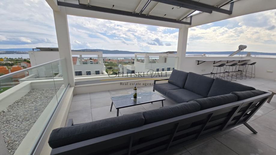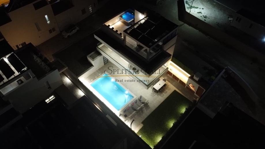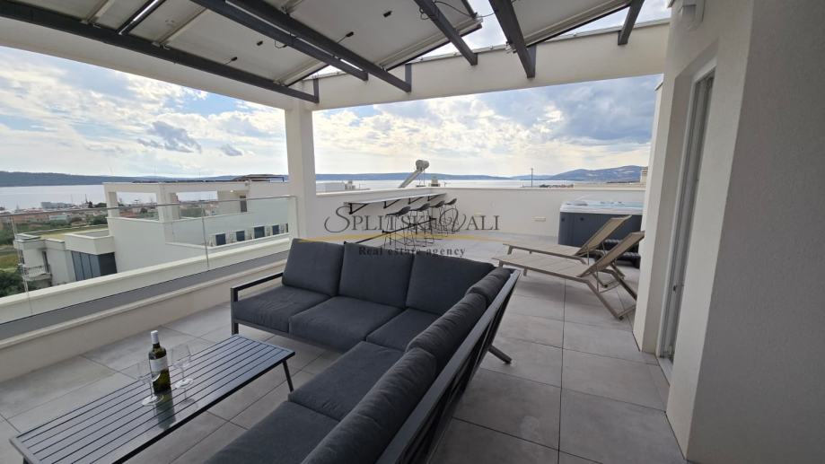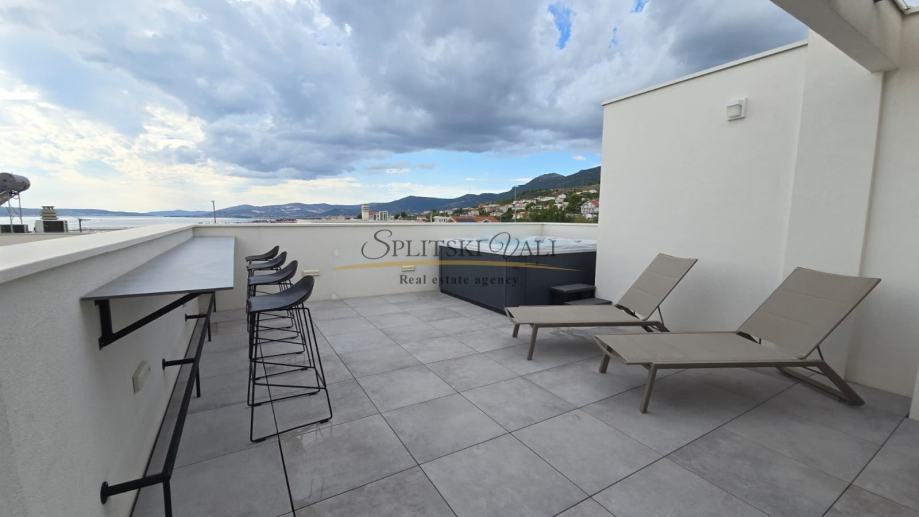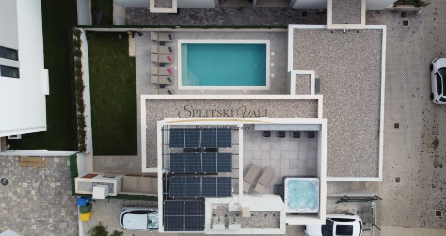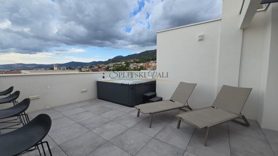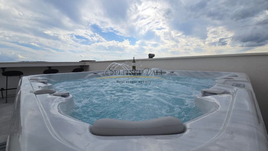 Sa druge etaže ove nekretnine se izlazi na krovnu terasu s jacuzzijem i panoramskim pogledom na more, pružajući jedinstveni prostor za uživanje na otvorenom.