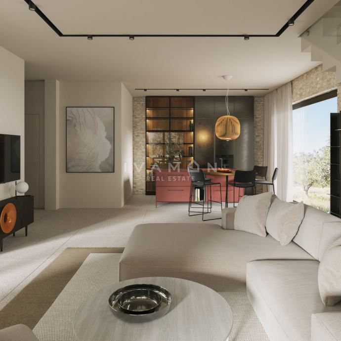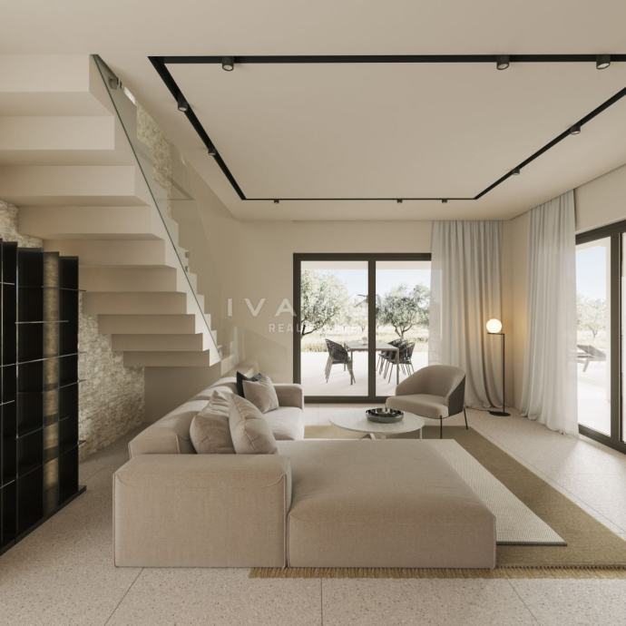 Ova prekrasan nova vila u istarskom stilu je pravo osvježenje na tržištu. Nalazi se u okolici Poreča, udaljena je od mora samo 4 km. Vila je završena, sa ugrađenom kuhinjom. Sastoji se od prostranog dnevnog boravka sa kuhinjom, spavaćom sobom sa svojim kupatilom , wc-om i prostorije za tehniku, sve u prizemlju. Iz dnevnog boravka se izlazi na veliku natkrivenu terasu na kojoj je ljetna kuhinja sa roštiljem. Na katu su dvije spavaće sobe, svaka sa svojim kupatilom, dok jedna ima izlaz na terasu. Grijanje je podno, dizalica topline. Kuća je klimatizirana. U dvorištu se nalazi bazen od 41 m2.