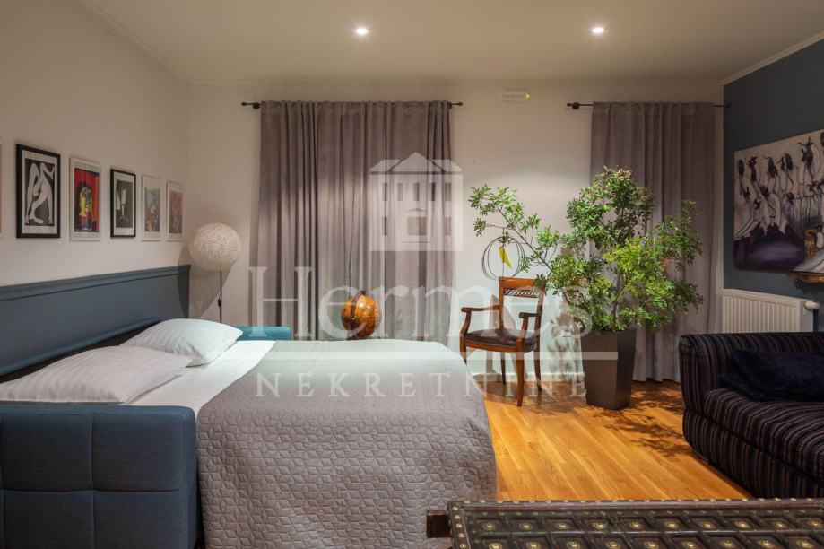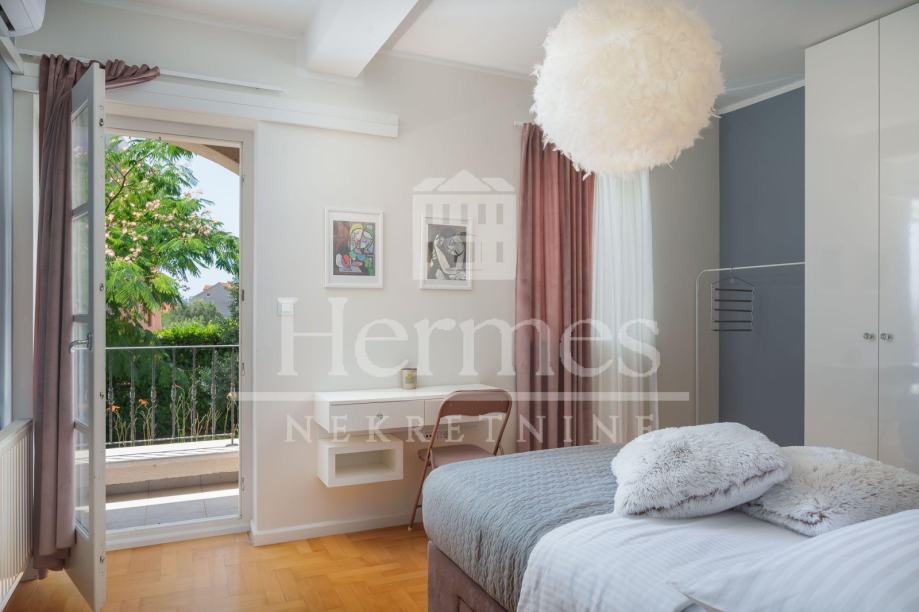 Na 1. katu nalaze se 3 spavaće sobe s pripadajućim kupaonicama i balkonima, radna / gostinjska soba na galeriji, veliki dnevni boravk s blagovaonicom i kuhinjom te izlazom na terasu, mediteranski vrt s bazenom i ljetnom kuhinjom s velikim stolom za druženje pod pergolom. Na istoj etaži također se nalaze zaseban, gostinjski WC i vešeraj.