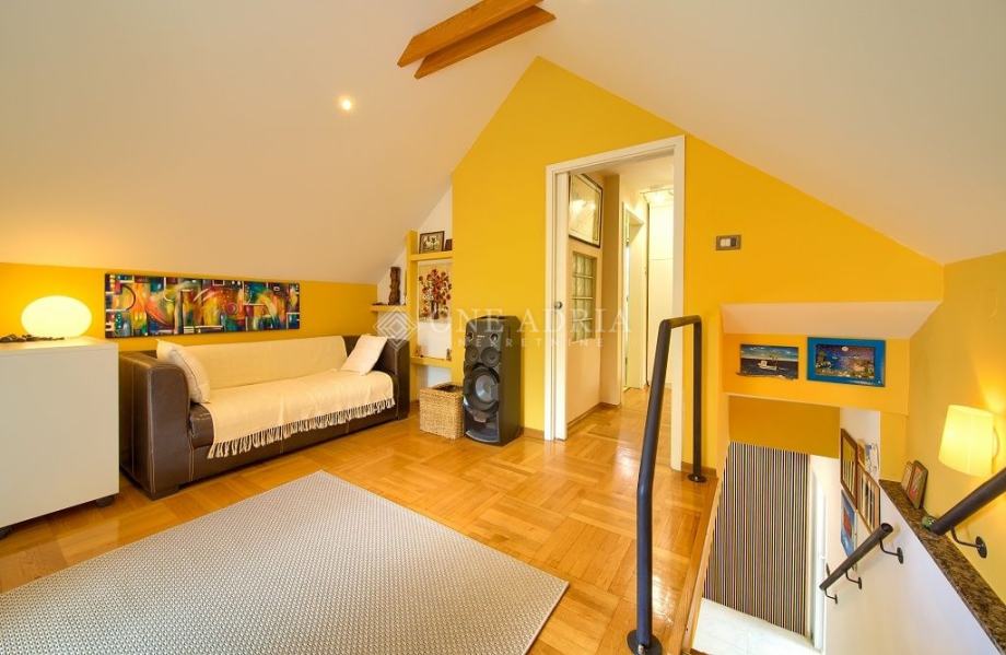 Nekretnina se proteže kroz tri etaže. U suterenu se nalaze dva spremišta, kotlovnica te posebno izolirana prostorija idealna za glazbene probe, studio, atelje, biblioteku ili slične kreativne i radne namjene. Prizemlje obuhvaća kuhinju povezanu s blagovaonicom, spavaću sobu s izlazom na terasu, kupaonicu s toaletom, garažno mjesto te ugodnu verandu koja poziva na boravak na otvorenom. U visokom potkrovlju smješten je dnevni boravak s izlazom na natkrivenu terasu, dodatna spavaća soba te kupaonica s toaletom, čime je prostor savršeno zaokružen za udoban obiteljski život ili boravak gostiju.