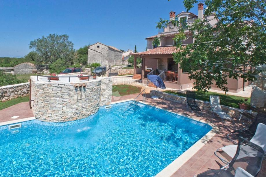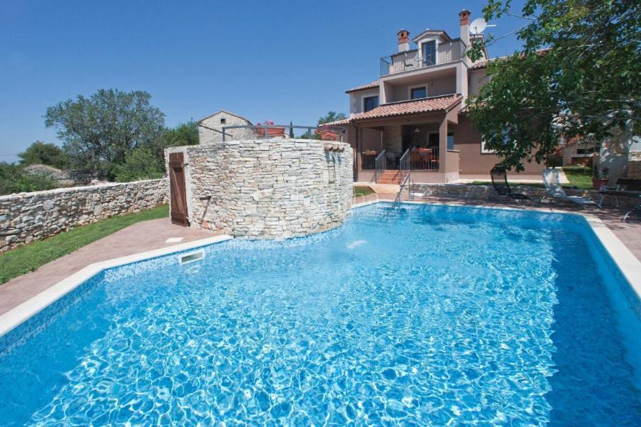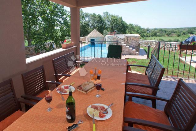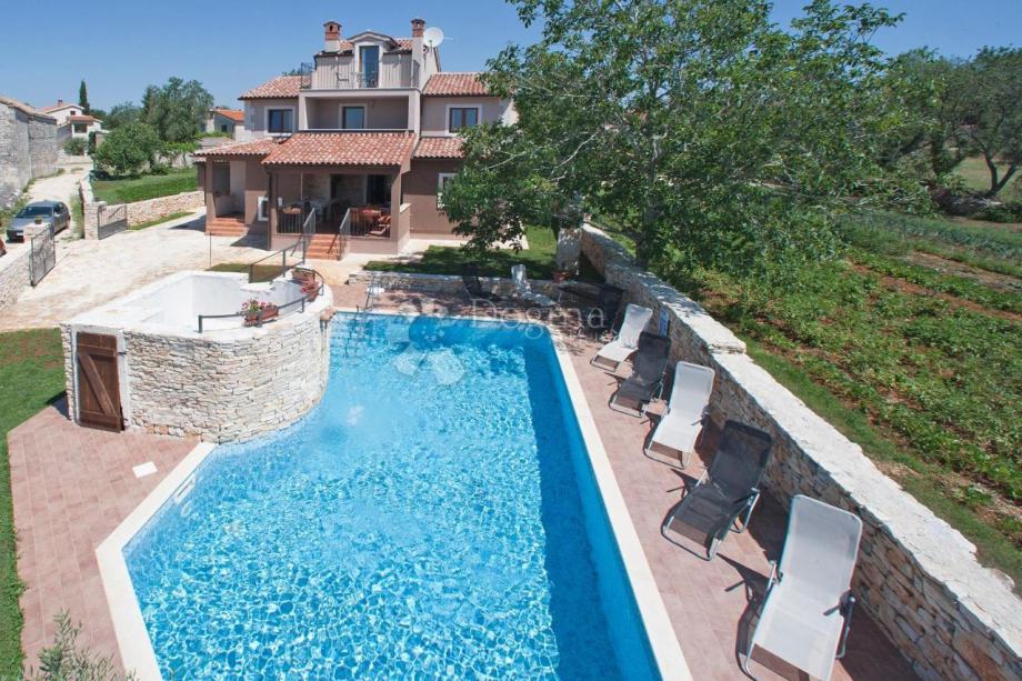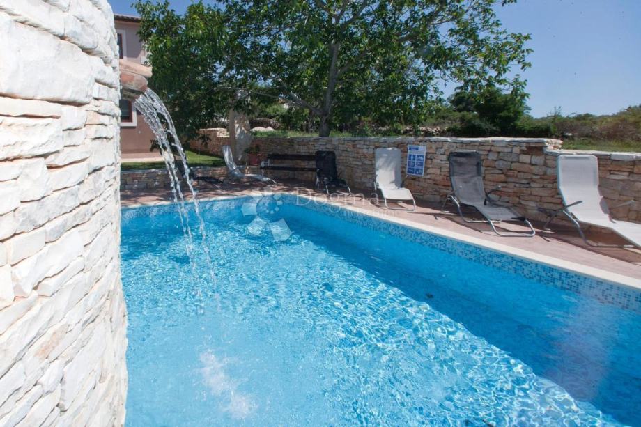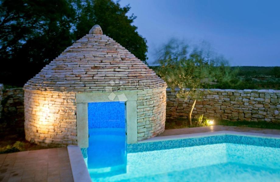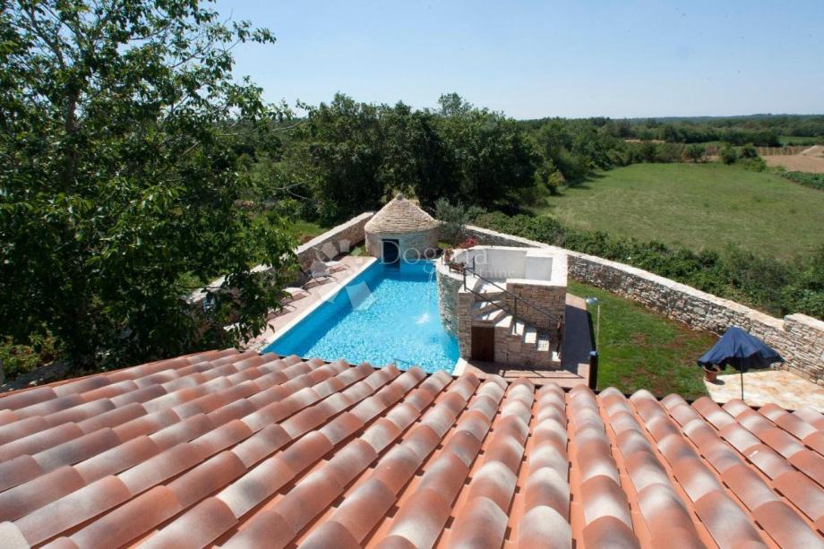 Iz dnevnog boravka je izlaz na natkrivenu terasu i vrt gdje se nalazi bazen od 53 m². U sklopu bazena je predivan istarski kažun.
