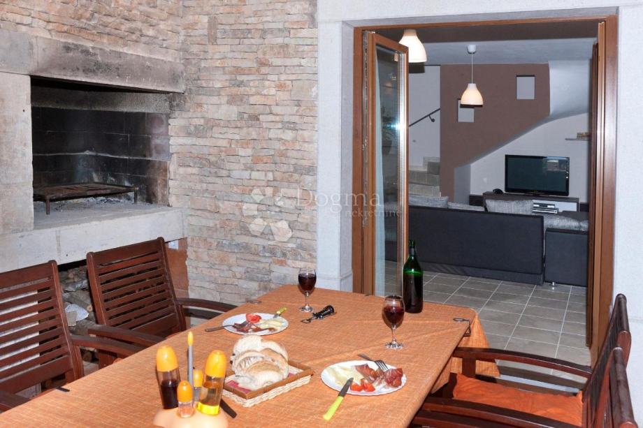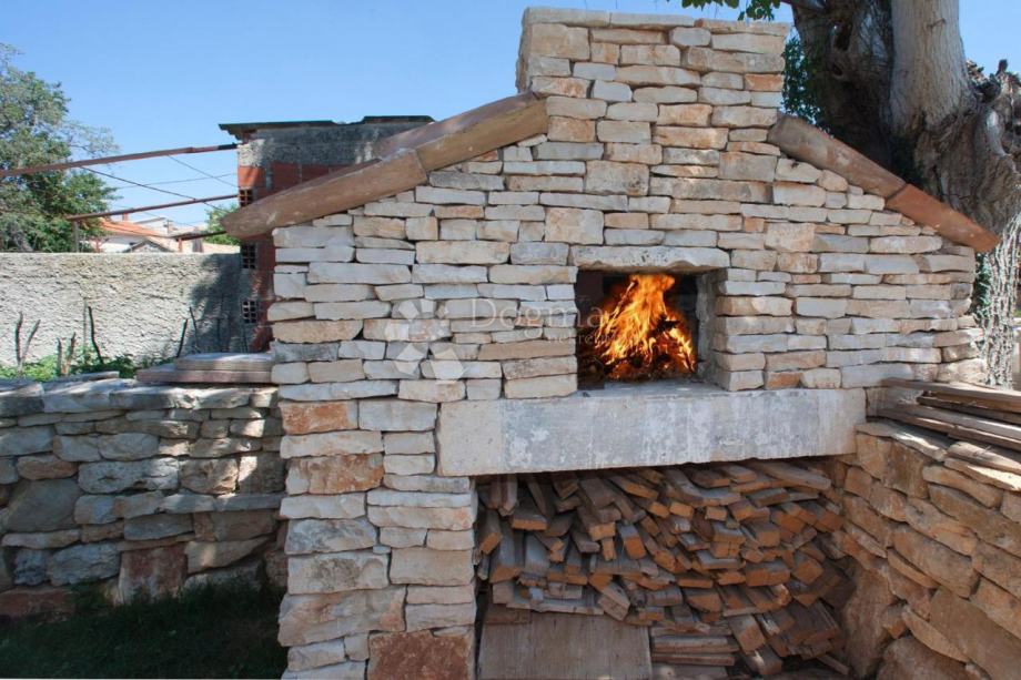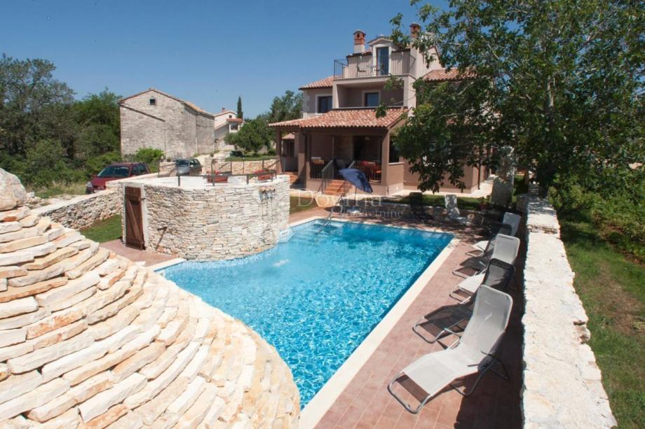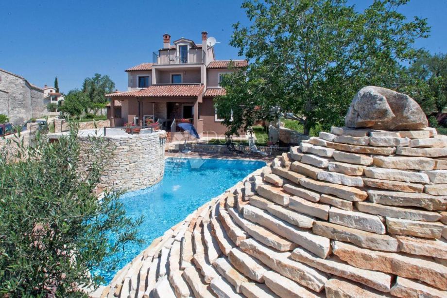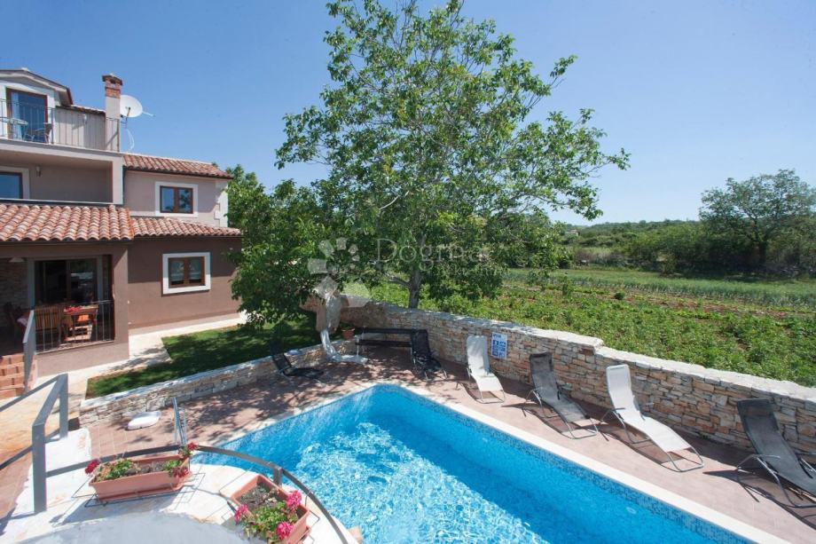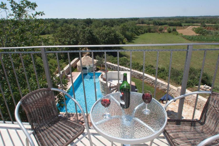 Iz dnevnog boravka je izlaz na natkrivenu terasu i vrt gdje se nalazi bazen od 53 m². U sklopu bazena je predivan istarski kažun.