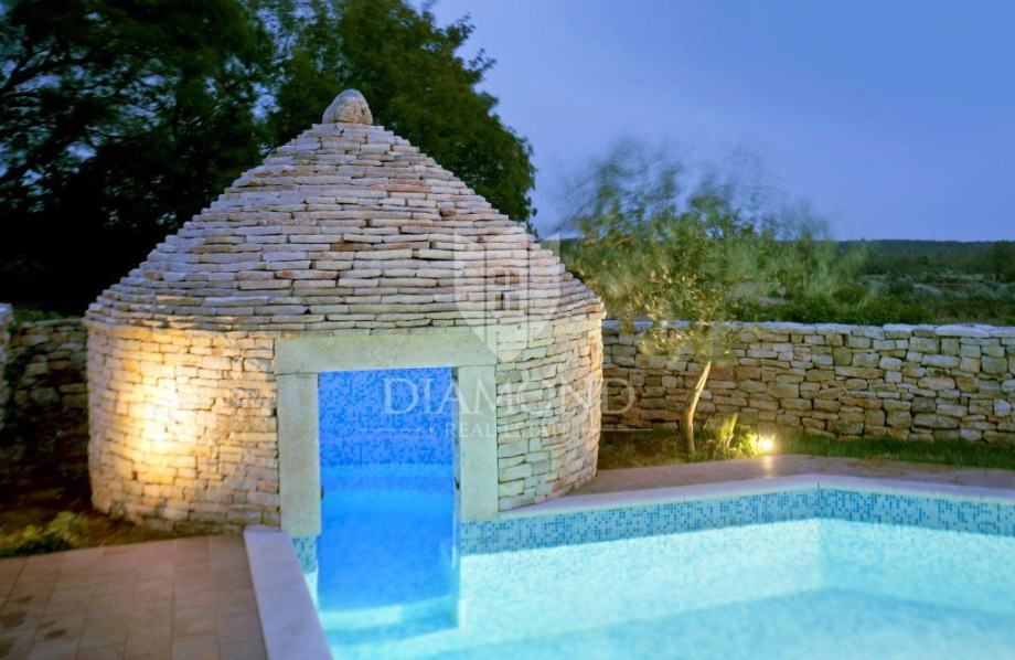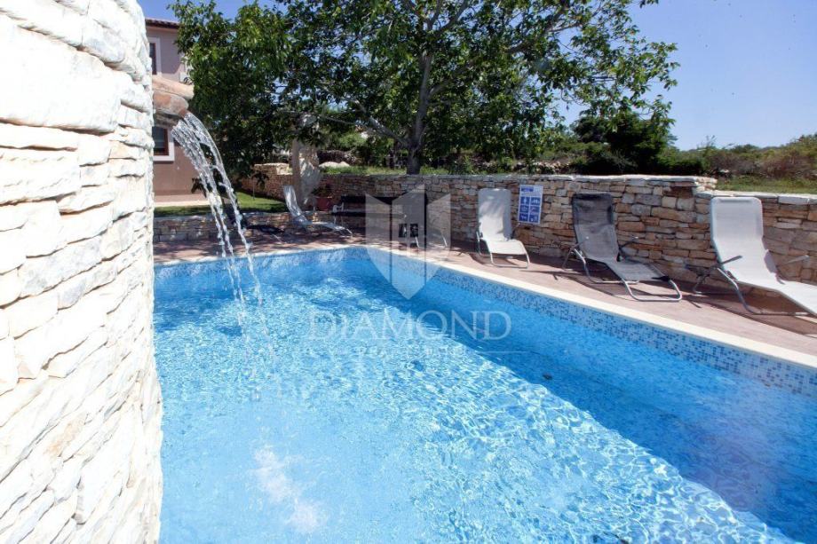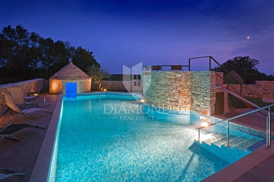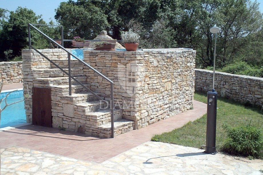 Okućnica broji 600 četvornih metara, a fokus je svakako na prekrasnom autentičnom bazenu kvadrature 55 m2 u kojemu se nalazi zidani istarski kažun. Cijeli bazen i kažun su osvijetljeni što stvara poseban ugođaj u večernjim satima. U sklopu bazena predviđen je i dio za hidromasažnu kadu čije su instalacije postavljene. Osim bazena, ograđena okućnica sadrži i parking za 5 automobila i krušnu peć, a pozicija kuće nudi izoliranost od ostatka naselja te mir i tišinu.