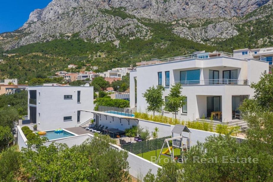 U prodaju se nudi ograđena vila za odmor, ekskluzivna vila koja ima panoramski pogled na kristalno čisto more i nalazi se u blizini mjesta Makarska, pored Omiša i Splita. Pozicionirana je na južnoj strani te odiše najvišom udobnošću, modernim interijerom i elegantnim dizajnom. Nudi idealan, moderan ambijent uz jedinstven pogled na mediteransku obalu. Uz veliku pažnju posvećenu detaljima interijera i eksterijera, modernoj tehničkoj opremi, najnovijim građevinskim materijalima i čarobnim dodirom glamura, ova vila pruža luksuzni odmor za svaku obitelj. Izgrađena je na dvije etaže.